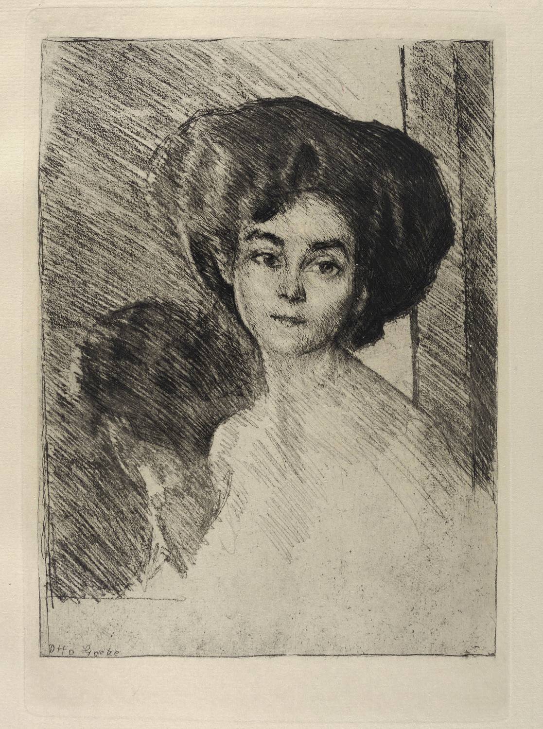 1913. Radierung / Vernis mou, in Schwarz, auf gelbem Van-Gelder-Zonen. – Originale Künstlergrafik, von Otto Goetze. – 21,8 x 16,0 cm (Darstellung / Druckbild), 33 x 23 cm (Blatt), 24,7 x 16,9 cm (Platte).