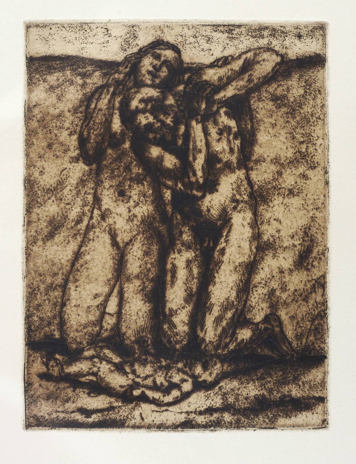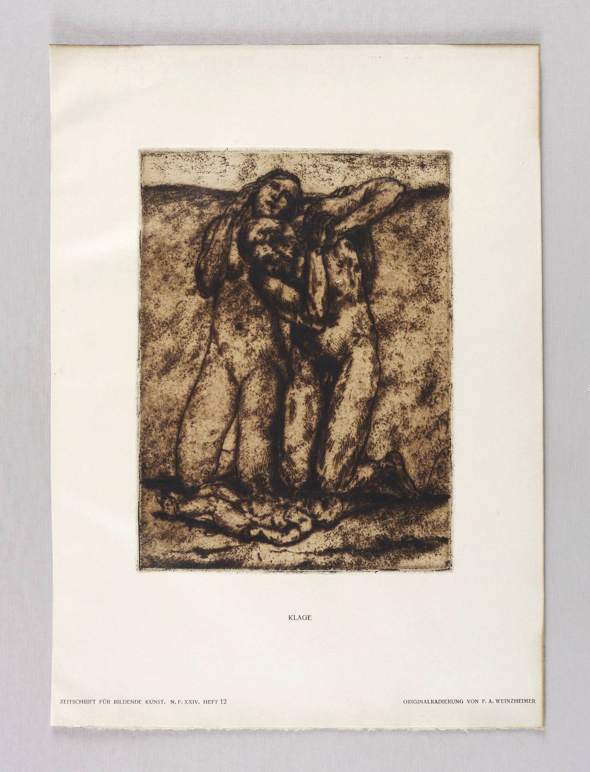 Aus: Zeitschrift für bildende Kunst (Leipzig: E.A. Seemann 1913), Bd. 24. – Nicht handsigniert. Unterhalb der Darstellung typografisch bezeichnet: ″KLAGE // ORIGINALRADIERUNG VON F.A. WEINZHEIMER″. Links unten Band-Nr. Wasserzeichen der Papiermühle. – In den Blattkanten stärker gegilbt. Sonst guter Zustand.