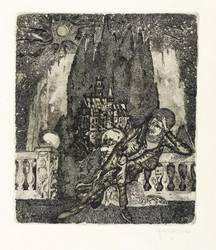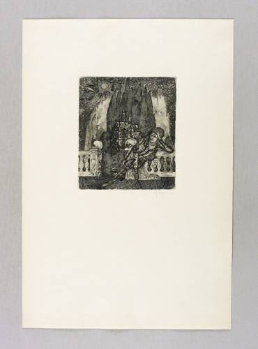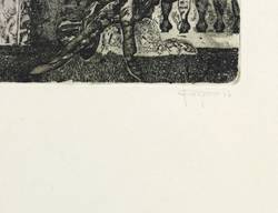 1977. Radierung / Strichätzung & Aquatinta, mit Plattenton, in Schwarz, auf gelblichem Velinkarton. – Originale Künstlergrafik, von Harry Jürgens. – 14,2 x 12,2 cm (Darstellung / Platte), 39 x 27 cm (Blatt).