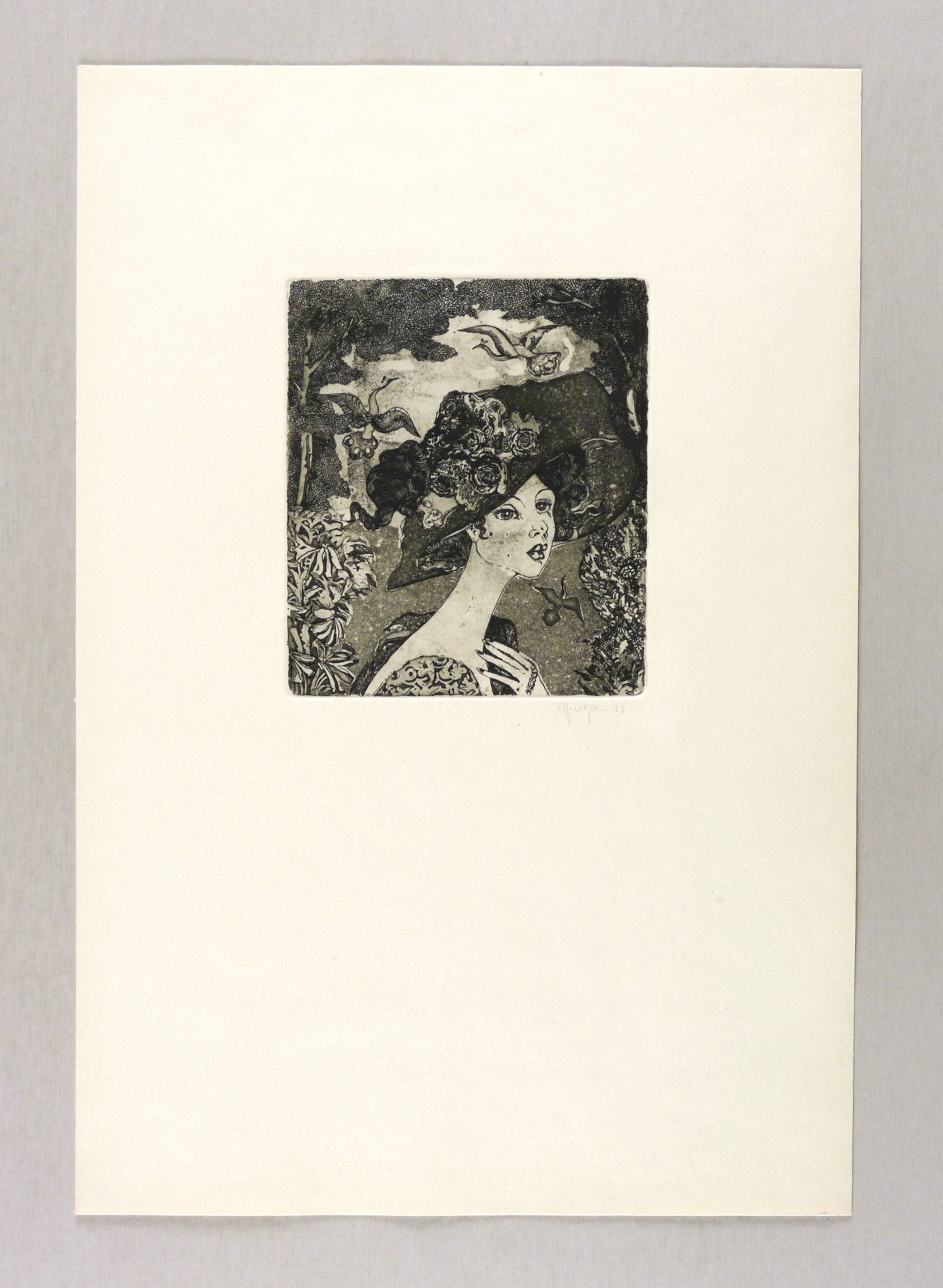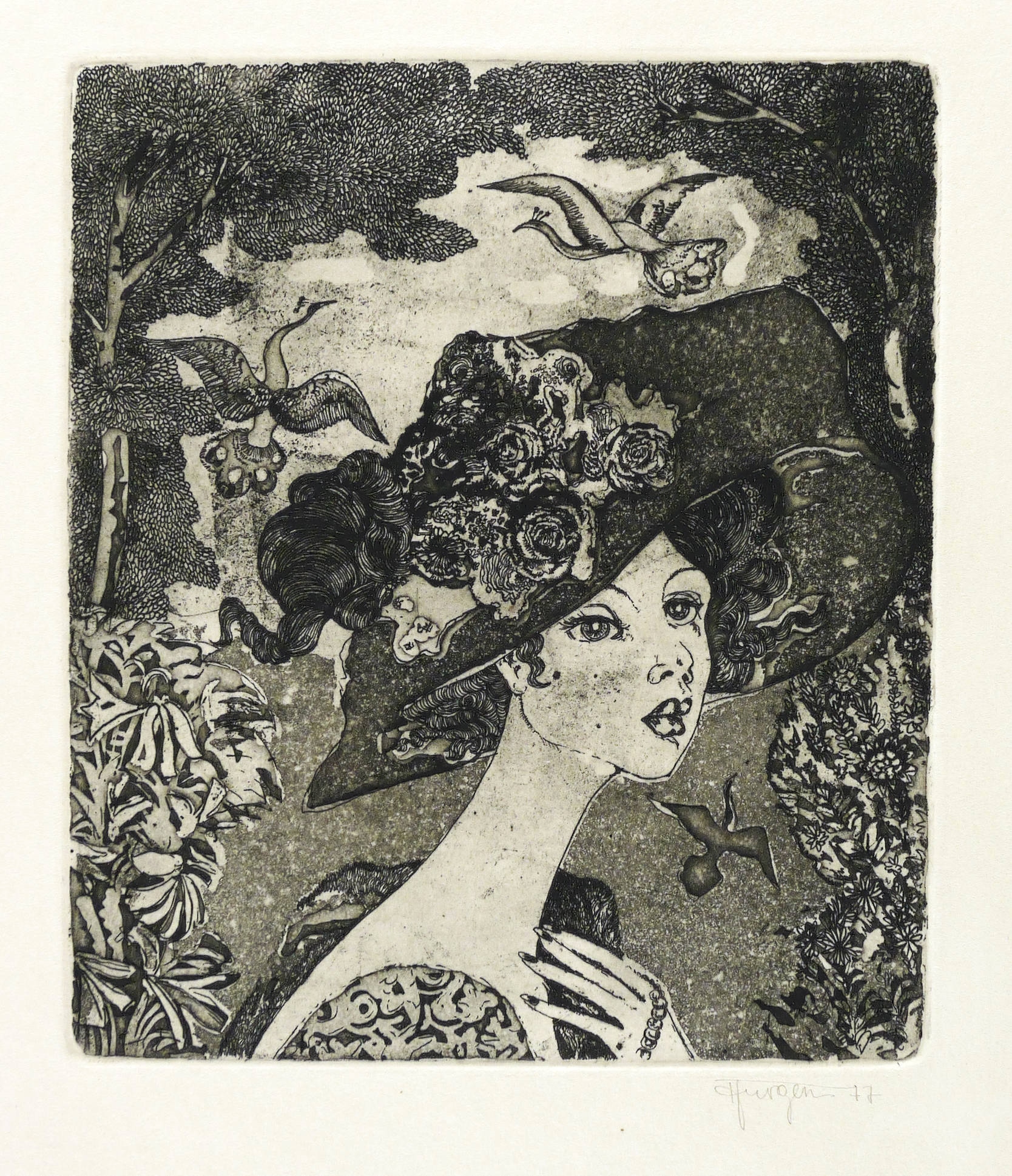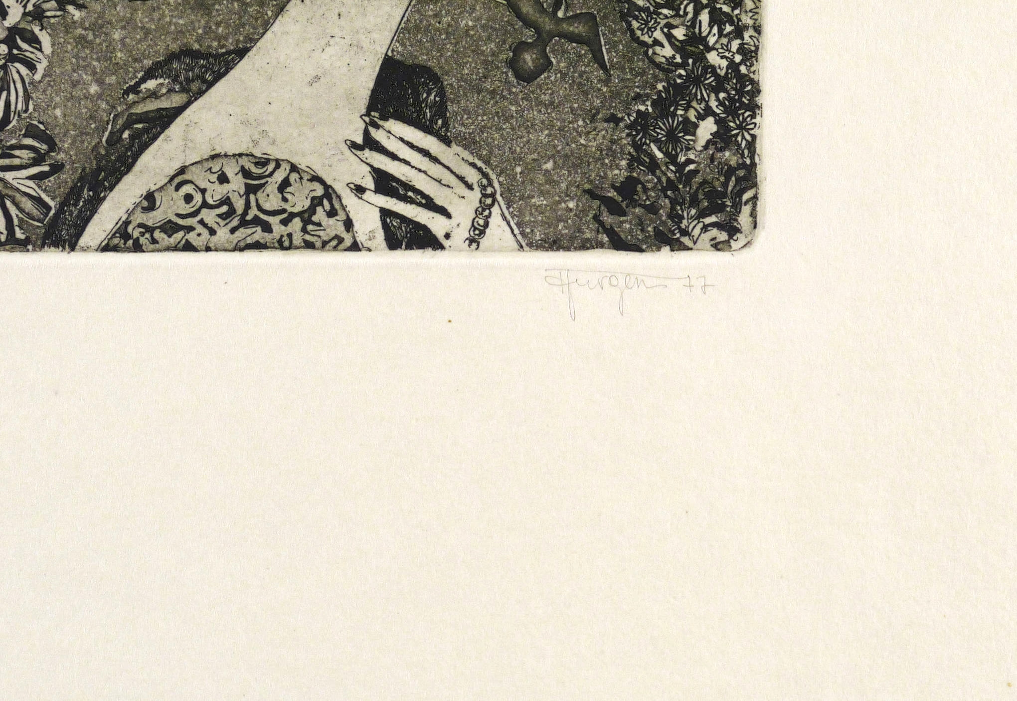 1977. Radierung / Strichätzung & Aquatinta, mit Plattenton, in Schwarz, auf gelblichem Velinkarton. – Originale Künstlergrafik, von Harry Jürgens. – 14,2 x 12,2 cm (Darstellung / Platte), 39 x 27 cm (Blatt).