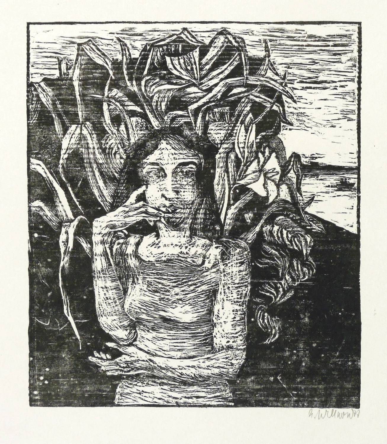 1977. Holzriss / Holzriß, in Schwarz, auf glattem gelblichem Velinkarton. – Originale Künstlergrafik, von Ellen Willnow. – 14,3 x 12,3 cm (Darstellung / Druckstock), 39 x 27 cm (Blatt).