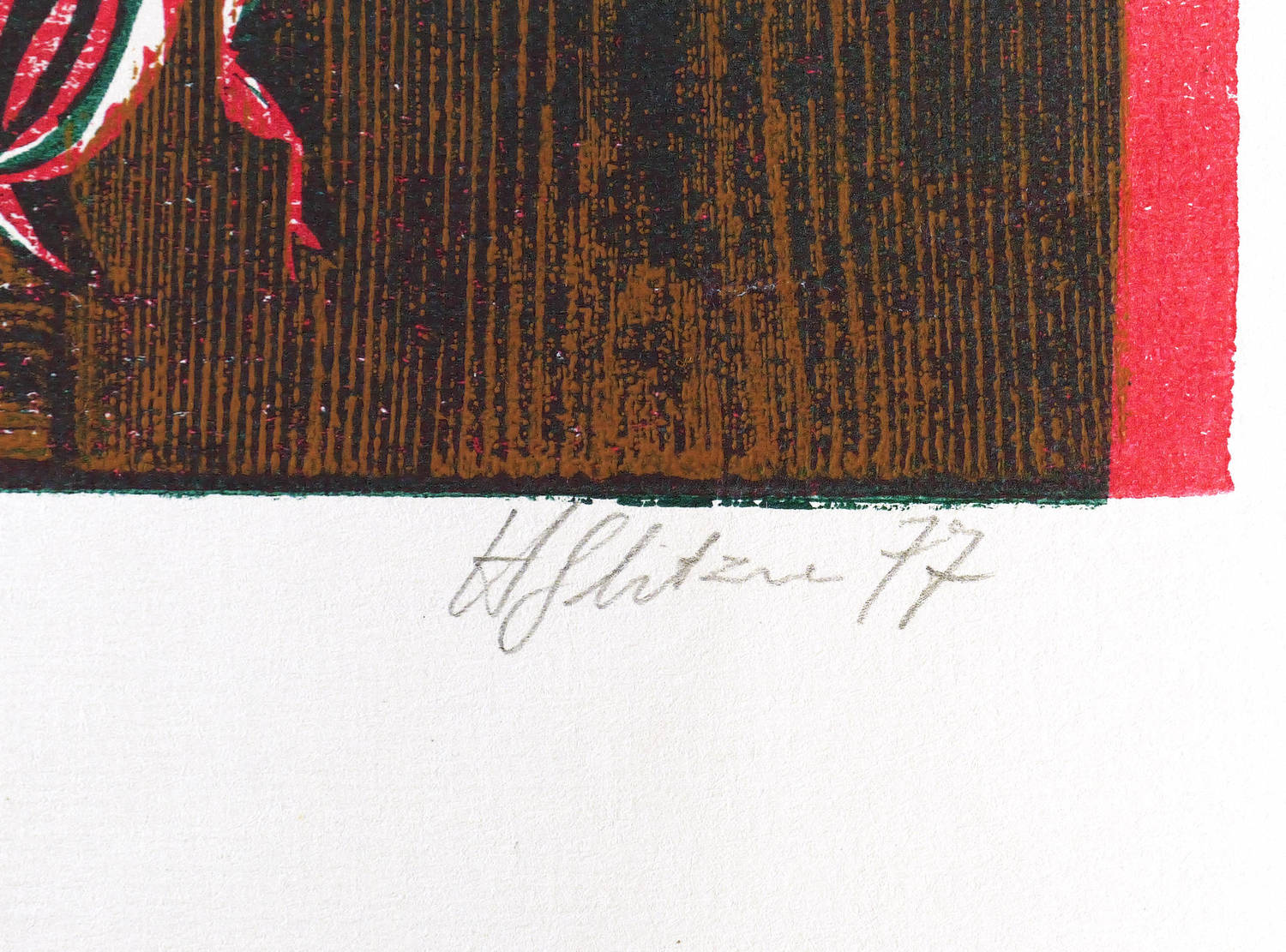 1977. Farbholzschnitt, in Rot & Grün, auf hellgelbem Maschinenbütten. – Originale Künstlergrafik, von Horst Glitzner. – 27,1 x 36,0 cm (Darstellung / Druckstock), 37 x 41 cm (Blatt).