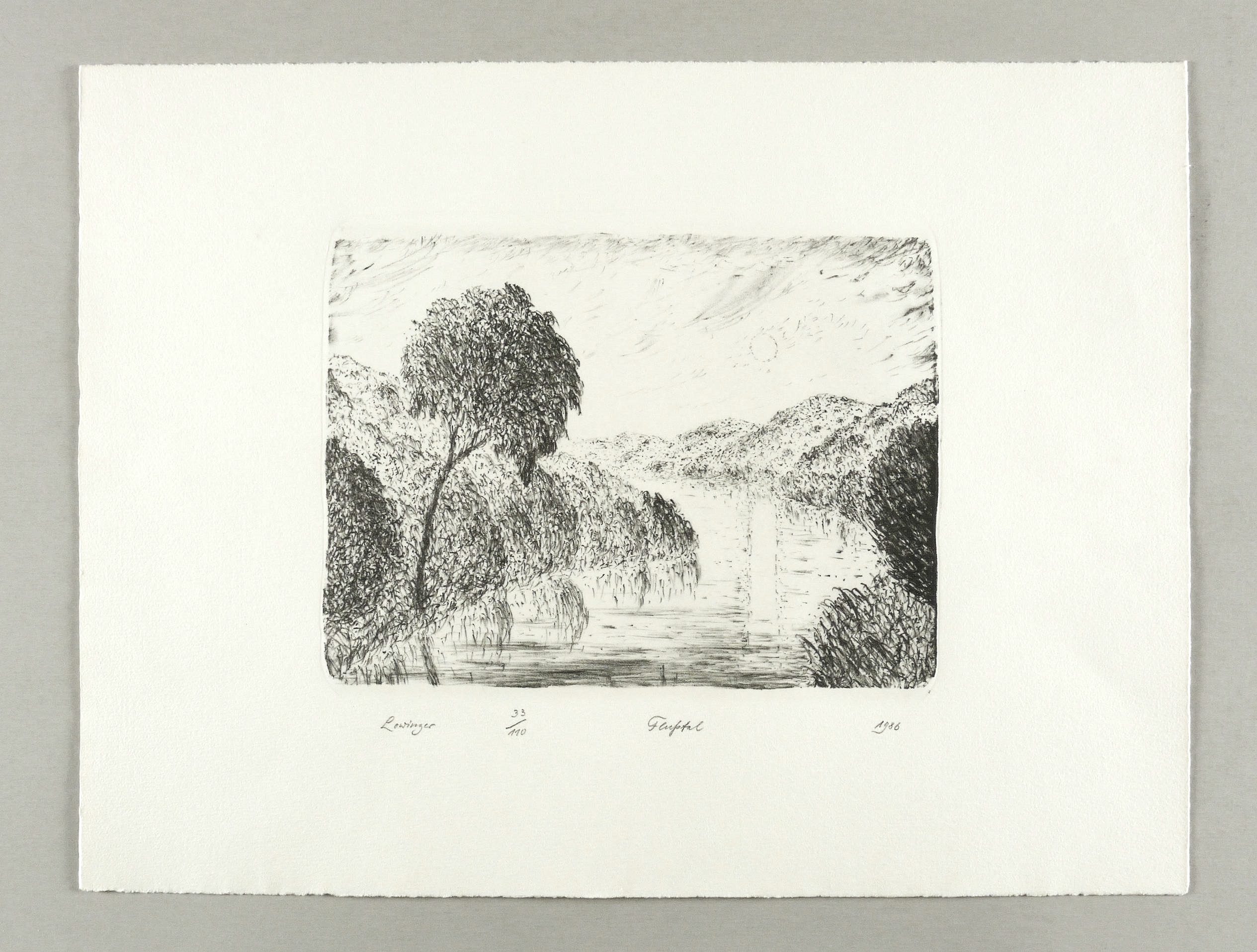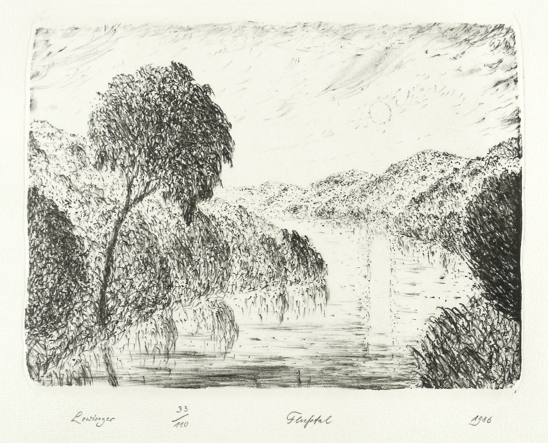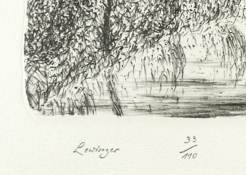 1986. Lithografie / Kreidelithografie, in Schwarz, auf hellchamois Hahnemühle-Bütten. – Originale Künstlergrafik, von Ernst Lewinger. – Auflage Exemplar Nr. 33/110. – 19,6 x 26,6 cm (Darstellung / Druckbild), 36 x 48 cm (Blatt).