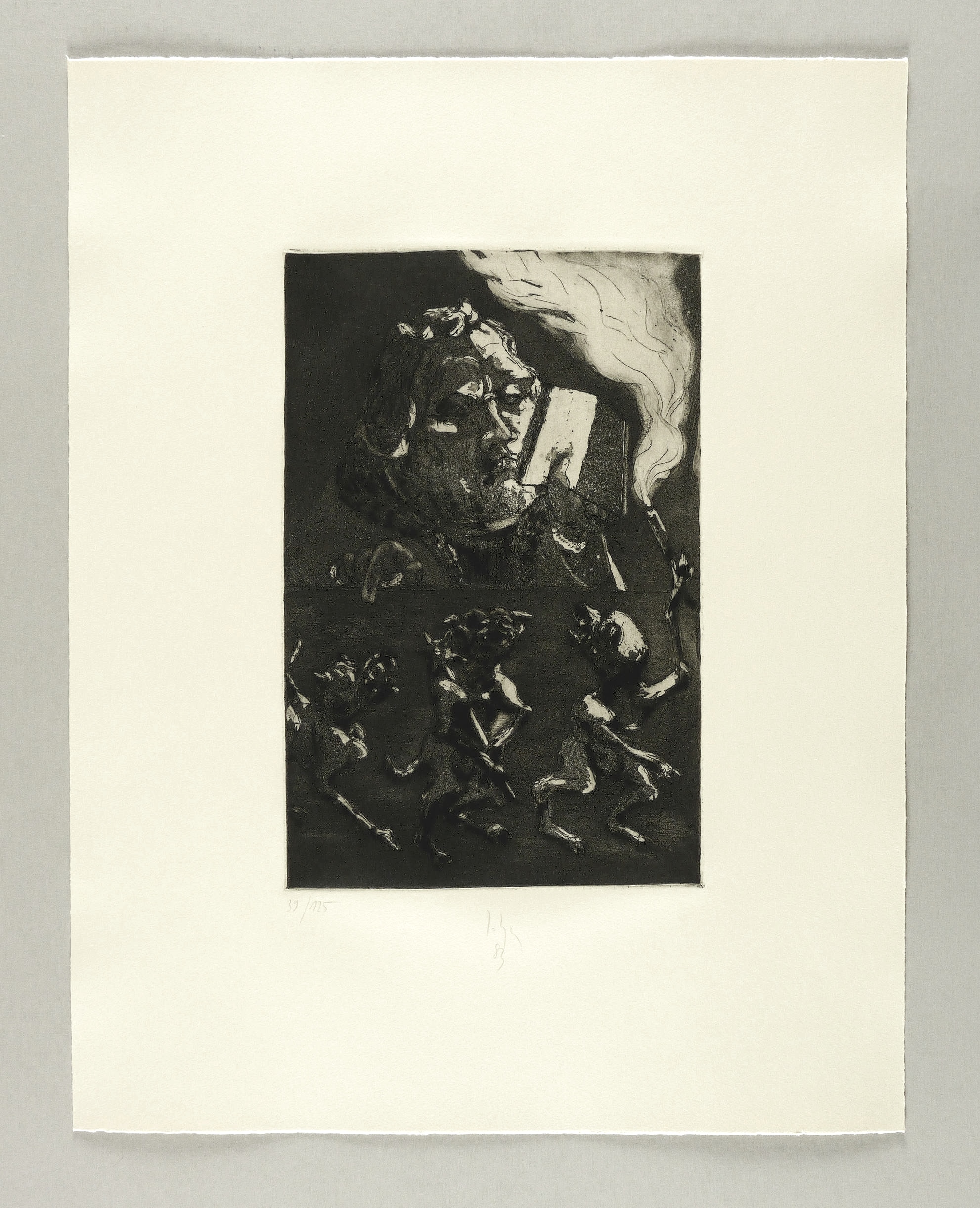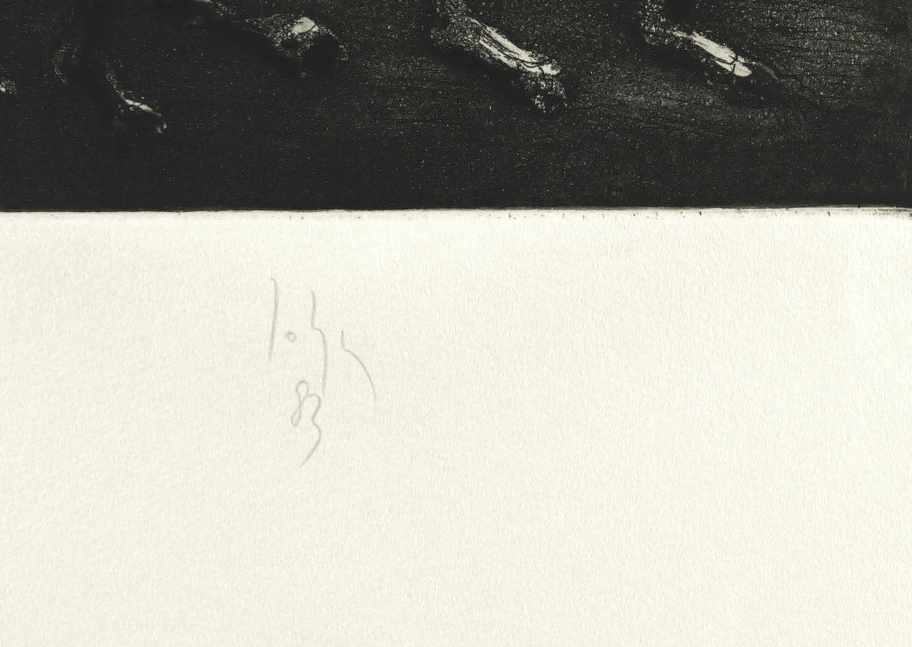 1983. Radierung / Aquatinta, in Schwarz, auf gelbem Velinkarton. – Originale Künstlergrafik, von Joachim John. – Auflage Exemplar Nr. 39/125. – 29,7 x 19,5 cm (Darstellung / Platte), 50 x 39 cm (Blatt).