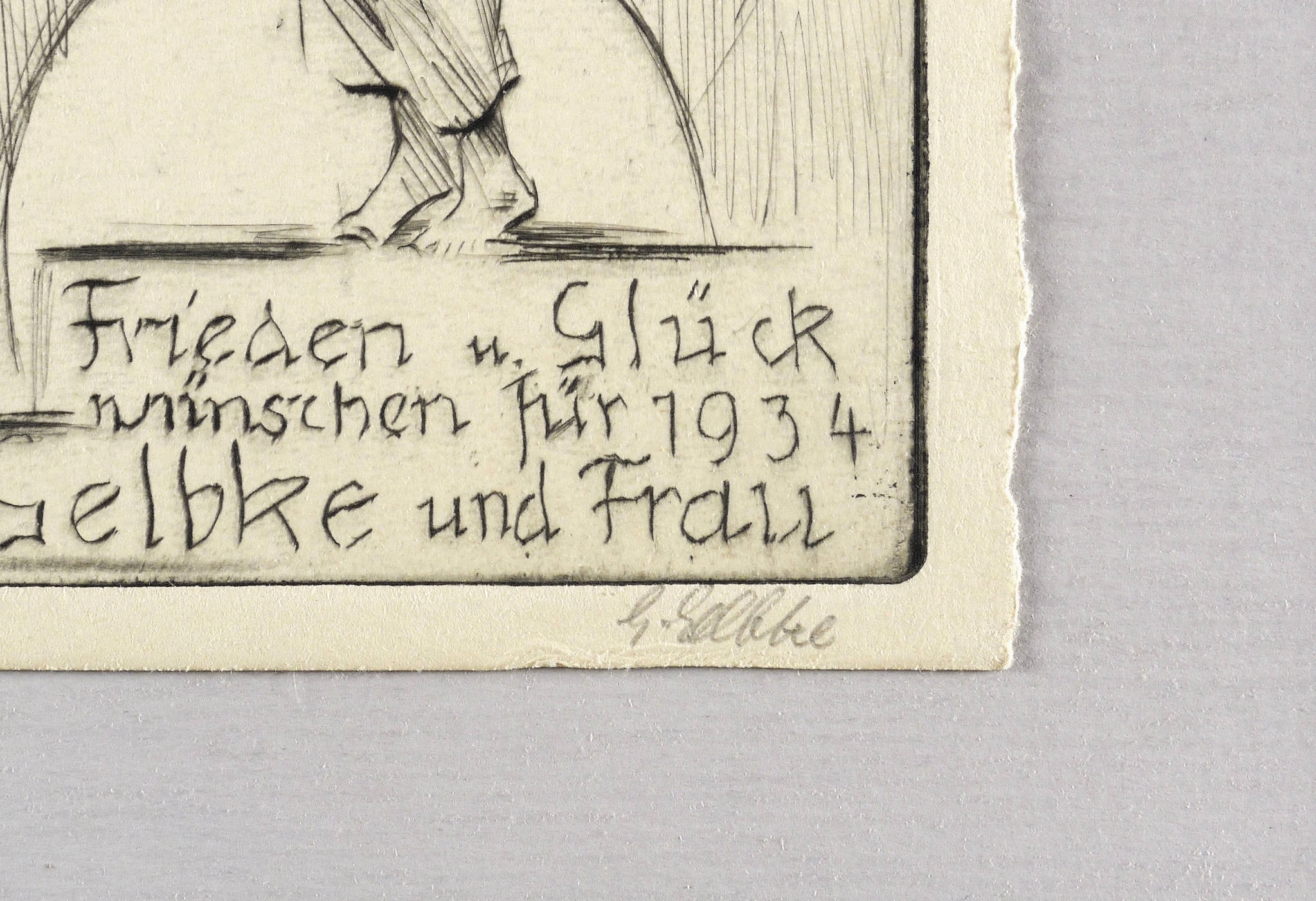 Rechts unten in Bleistift signiert: ″G. Gelbke″. In der Platte Inschrift: ″Frieden und Glück für 1934 wünschen G. Gelbke und Frau″. – Tadellos. Sehr guter Zustand.