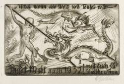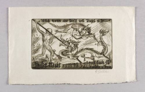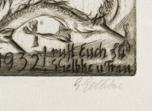 Rechts unten in Bleistift signiert: ″G. Gelbke″. In der Platte Inschrift: ″und wenn die Welt voll Teufel wär // Fasset Mut auch 1932! ruft Euch zu G. Gelbke und Frau″. – Tadellos. Sehr guter Zustand.