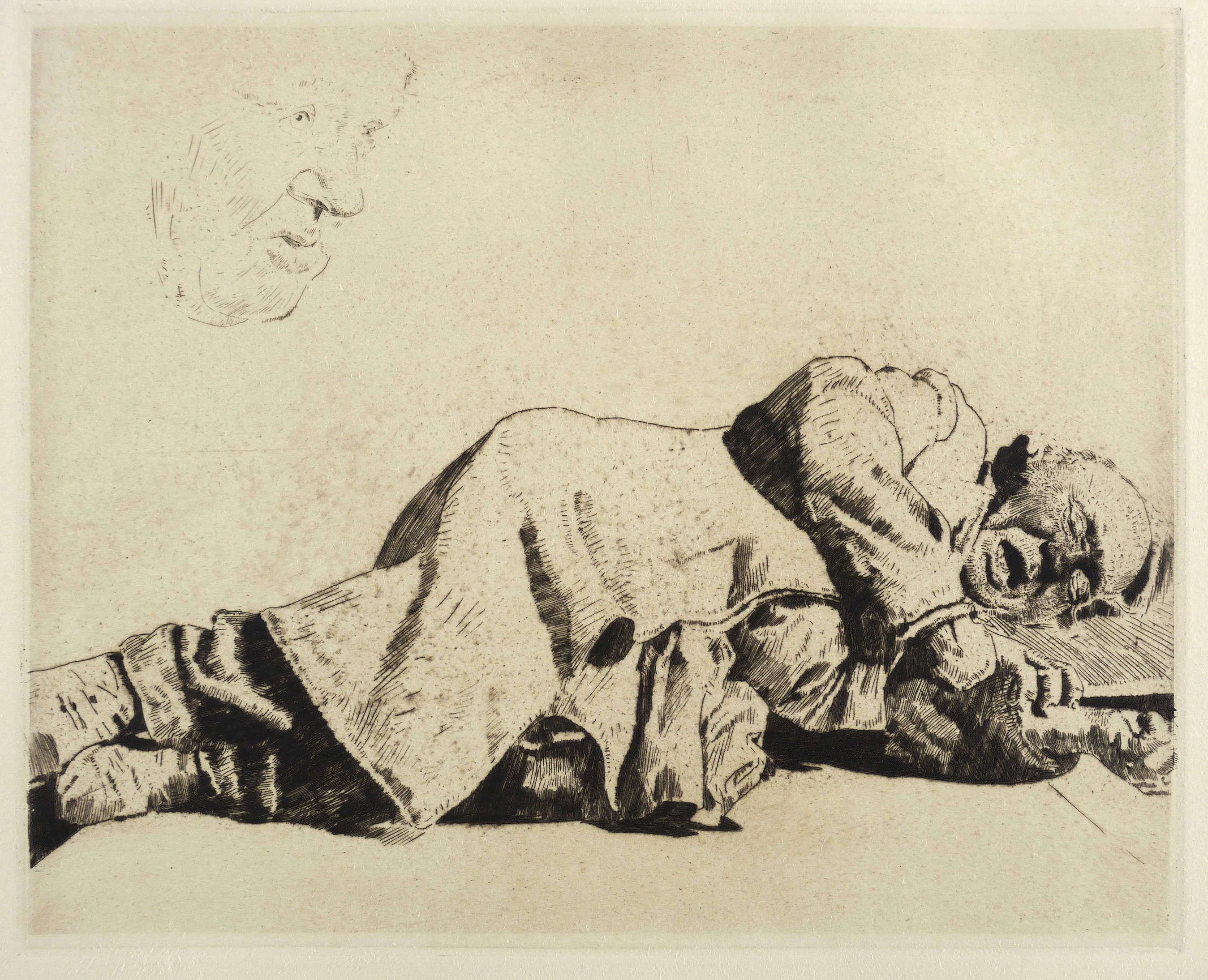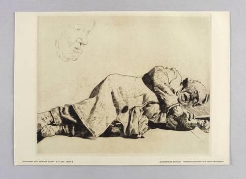 Aus: Zeitschrift für bildende Kunst (Leipzig: E.A. Seemann 1914), Bd. 25. – Nicht handsigniert. Unterhalb der Darstellung typografisch bezeichnet: ″SCHLAFENDER BETTLER. // ORIGINALRADIERUNG VON ERICH WOLFSFELD″. Links Bandangabe. – Sehr guter Zustand.
