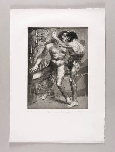 Wolfgang Peuker (1945 Aussig - 2001 Groß Glienicke). Deutscher Maler und Grafiker der Leipziger Schule. 1963-65 Ausbildung zum Offsetdrucker. 1965-70 Studium an der Hochschule für Grafik und Buchkunst Leipzig (HGB) bei Werner Tübke, Bernhard Heisig und Wolfgang Mattheuer. Danach freischaffend in Leipzig und Zwickau. 1975 Käthe-Kollwitz-Preis. 1977-89 Lehrtätigkeit an der Hochschule für Grafik und Buchkunst in Leipzig. 1983 Kunstpreis der Stadt Leipzig. 1984 Teilnahme an der Biennale in Venedig, Kunstpreis der DDR. 1990 Berufung an die Kunsthochschule Berlin-Weißensee, 1993 Professur ebenda.