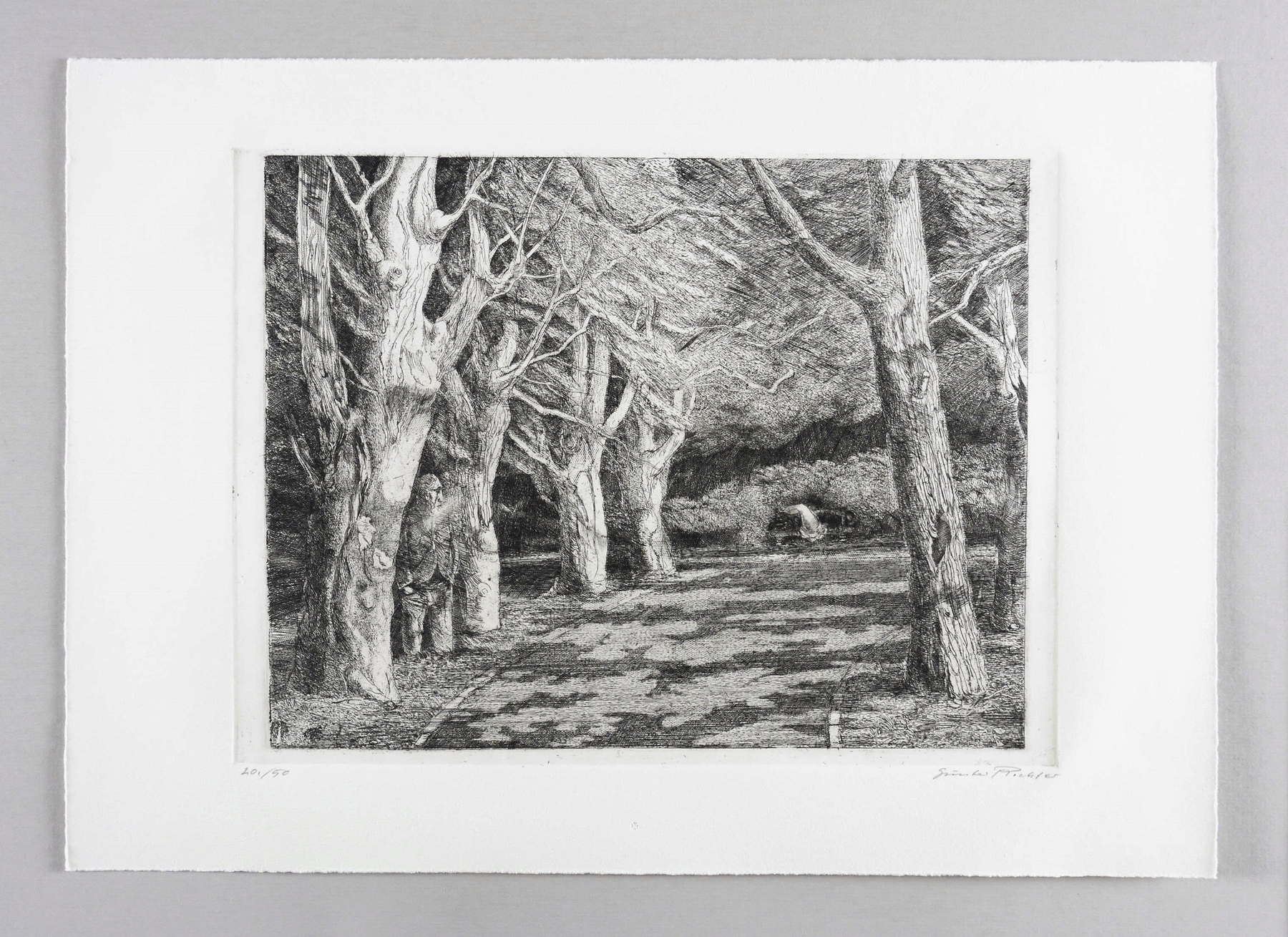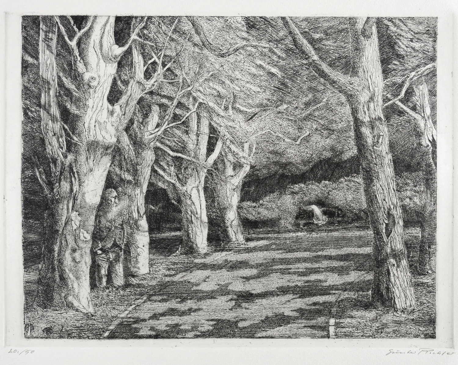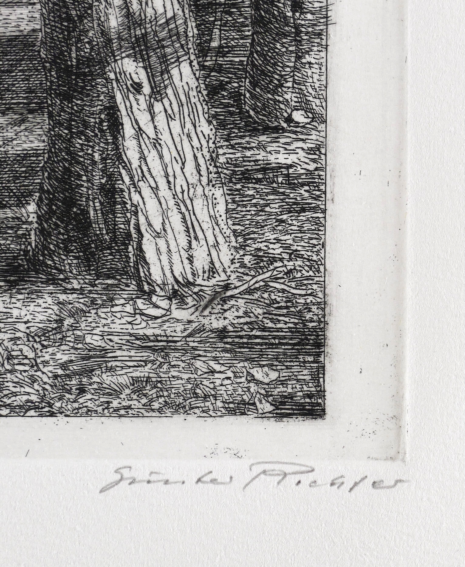 1987. Radierung / Strichätzung & Roulette, in Schwarz, auf hellchamois Velin. – Originale Künstlergrafik, von Günter Richter. – Auflage Exemplar Nr. 20/50. – 34 x 48 cm (Blatt), 25,7 x 34,3 cm (Platte), 24,8 x 31,7 cm (Darstellung / Druckbild).