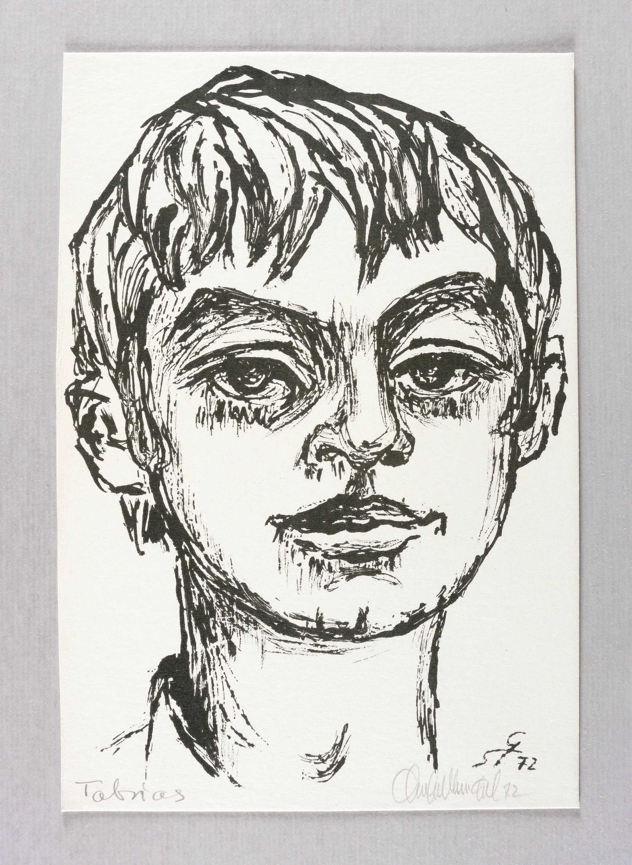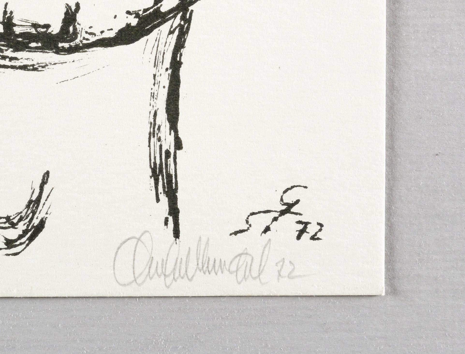 1972. Algrafie / Pinselalgrafie, in Schwarz, auf glattem hellgelbem Velinkarton. – Originale Künstlergrafik, von Gerhard Stengel. – 23,3 x 16,2 cm (Darstellung / Druckbild), 25 x 17 cm (Blatt).