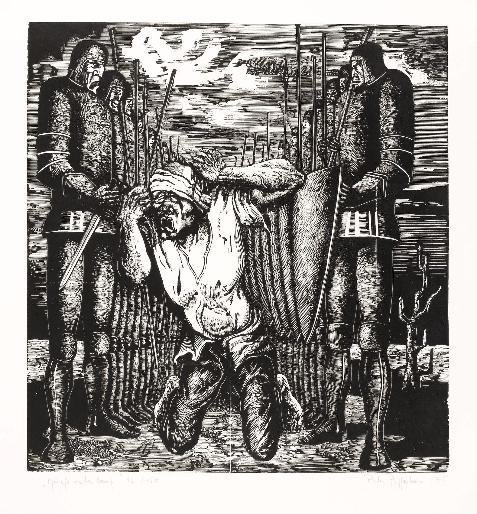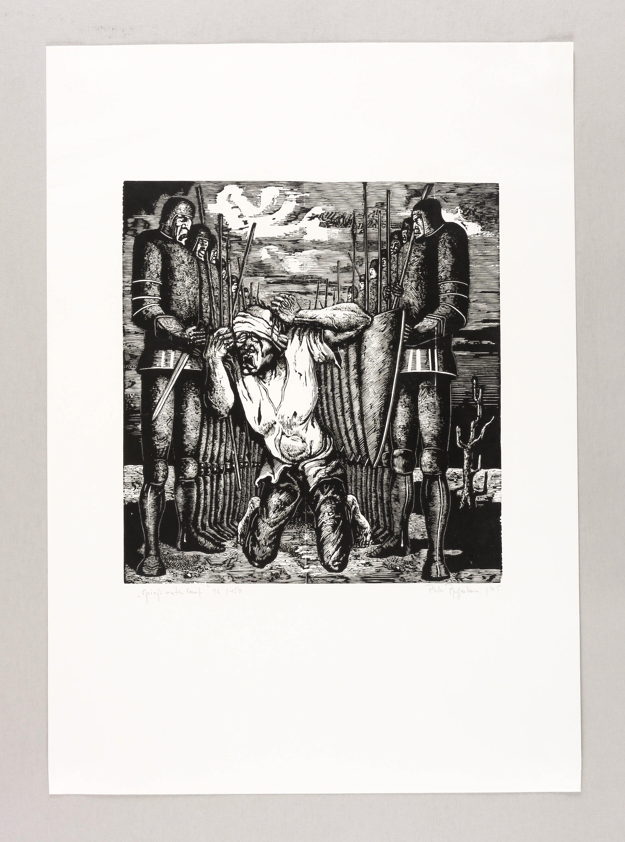 Aus: Grafik. Zum 450. Jahrestag des Deutschen Bauernkrieges 1975 (Berlin: Ministerium für Kultur der DDR 1975). – Rechts unten in Bleistift signiert und datiert. Links Titel und Auflagenbezeichnung. – Rückseitig in den Blattecken leichte Montagereste. Sehr guter Zustand.