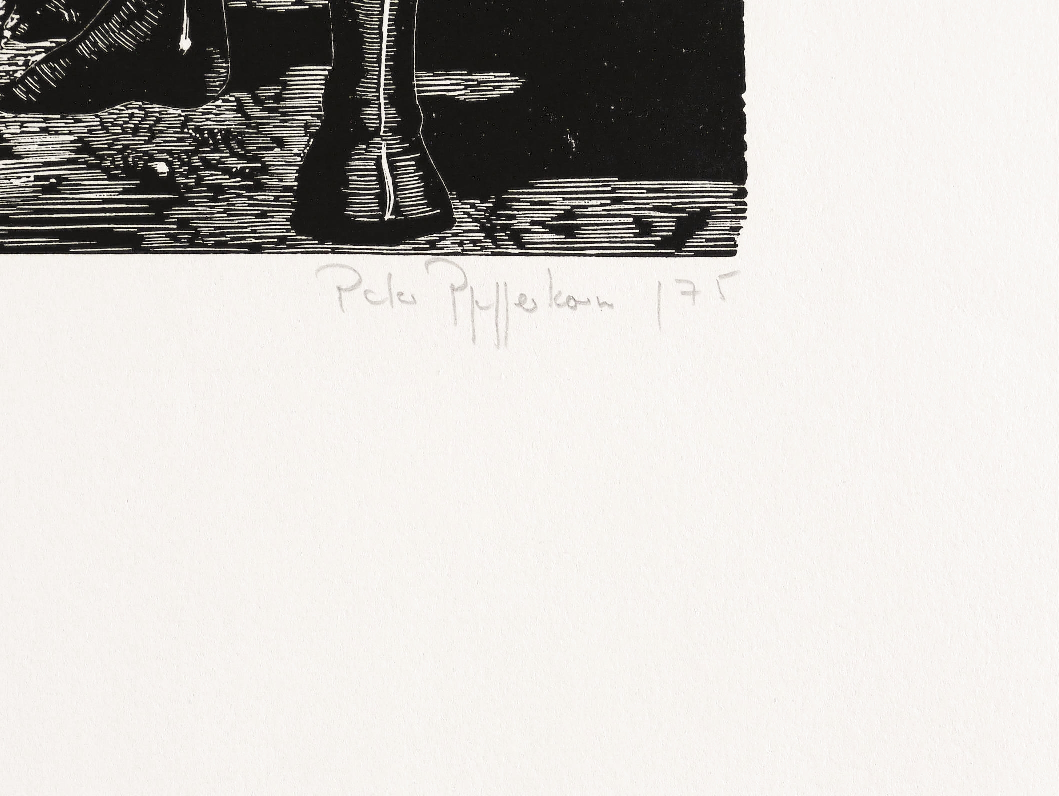 1975. Holzschnitt, in Schwarz, auf leichtem weißem Werkdruckpapier. – Originale Künstlergrafik, von Peter Pfefferkorn. – Auflage Exemplar Nr. 12/150. – 25,8 x 24,2 cm (Darstellung / Druckstock), 48 x 34 cm (Blatt).