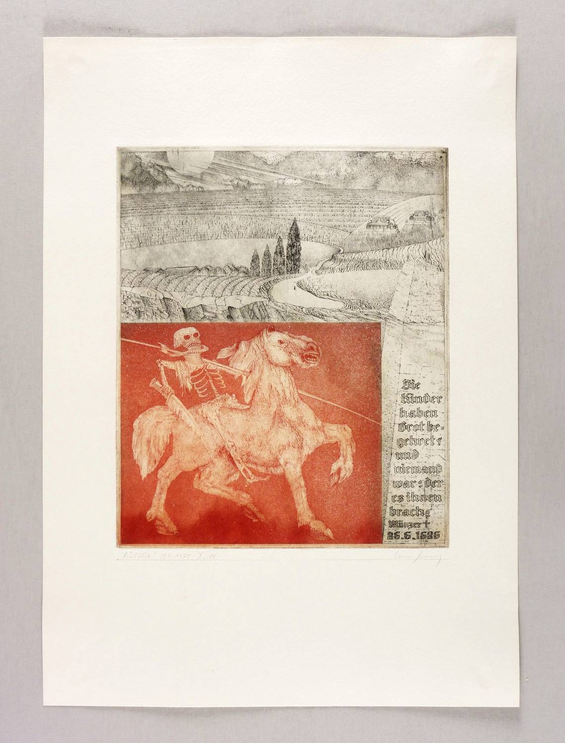 1975. Farbradierung / Strichätzung & Kaltnadel, in Schwarz & Rot, auf hartem hellchamois Velinkarton. – Originale Künstlergrafik, von Werner Hennig. – Auflage Exemplar Nr. 12/150. – 28,8 x 23,9 cm (Darstellung / Platte), 48 x 34 cm (Blatt).