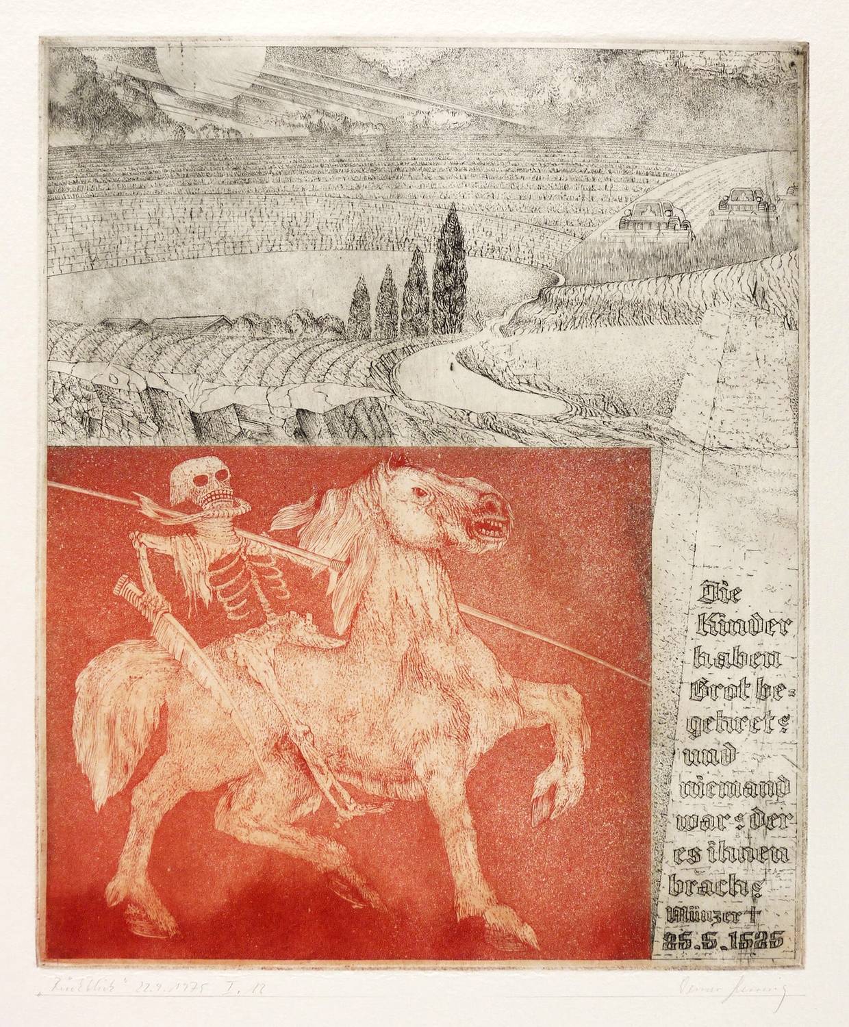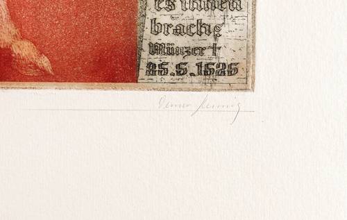 Aus: Grafik. Zum 450. Jahrestag des Deutschen Bauernkrieges 1975 (Berlin: Ministerium für Kultur der DDR 1975). – Rechts unten in Bleistift signiert. Links Titel, Jahr und Auflagenbezeichnung. – Rückseitig in den Blattecken leichte Montagereste. Sehr guter Zustand.
