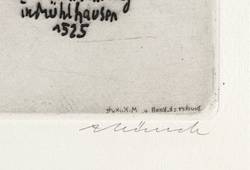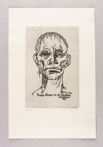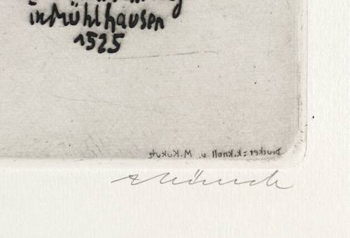 Aus: Grafik. Zum 450. Jahrestag des Deutschen Bauernkrieges 1975 (Berlin: Ministerium für Kultur der DDR 1975). – Rechts unten in Bleistift signiert. Links Auflagenbezeichnung. In der Platte Inschrift und Signatur. – Rückseitig in den Blattecken leichte Montagereste. Sehr guter Zustand.