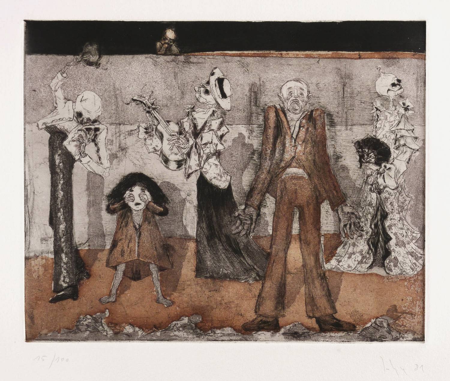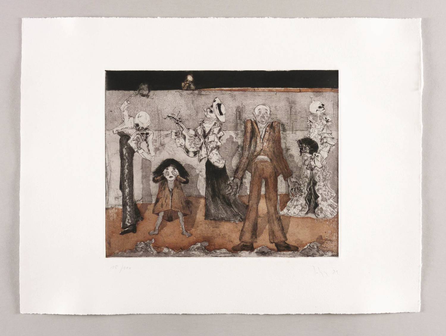 1981. Farbradierung / Strichätzung, Aquatinta, Vernis mou & Kaltnadel, in in Rotbraun & Schwarz, auf schwerem hellchamois Hahnemühle. – Originale Künstlergrafik, von Joachim John. – Auflage Exemplar Nr. 15/100. – 40 x 54 cm (Blatt), 25,1 x 31,1 cm (Darstellung / Platte).