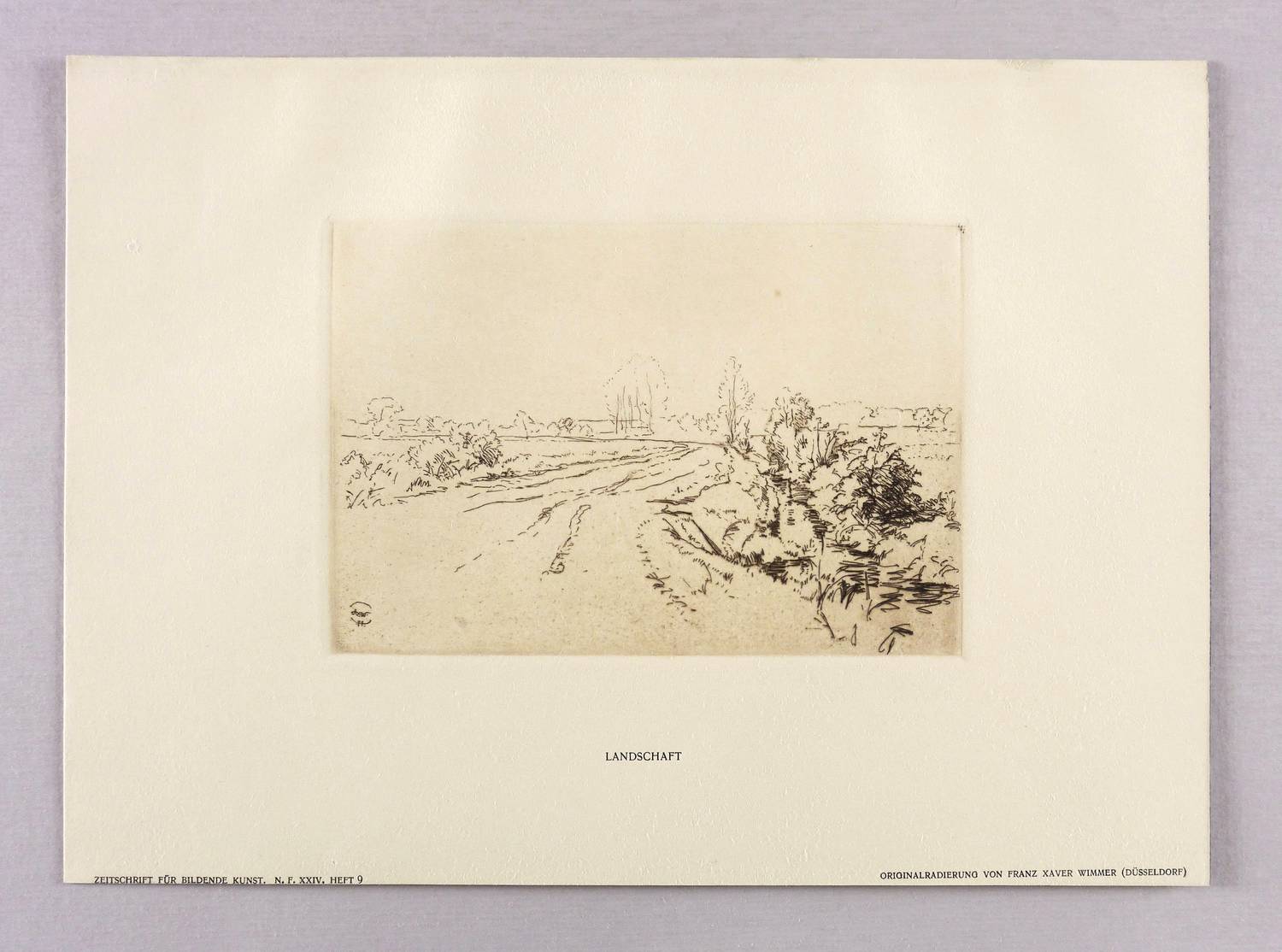 Aus: Zeitschrift für bildende Kunst (Leipzig: E.A. Seemann 1913), Bd. 24. – In der Platte links unten datiertund datiert: ″f.x.w. 11.″ Unterhalb typografisch bezeichnet: ″LANDSCHAFT // ORIGINALRADIERUNG VON FRANZ XAVER WIMMER (DÜSSELDORF)″. Links Bandbezeichnung. – Sehr guter Zustand.
