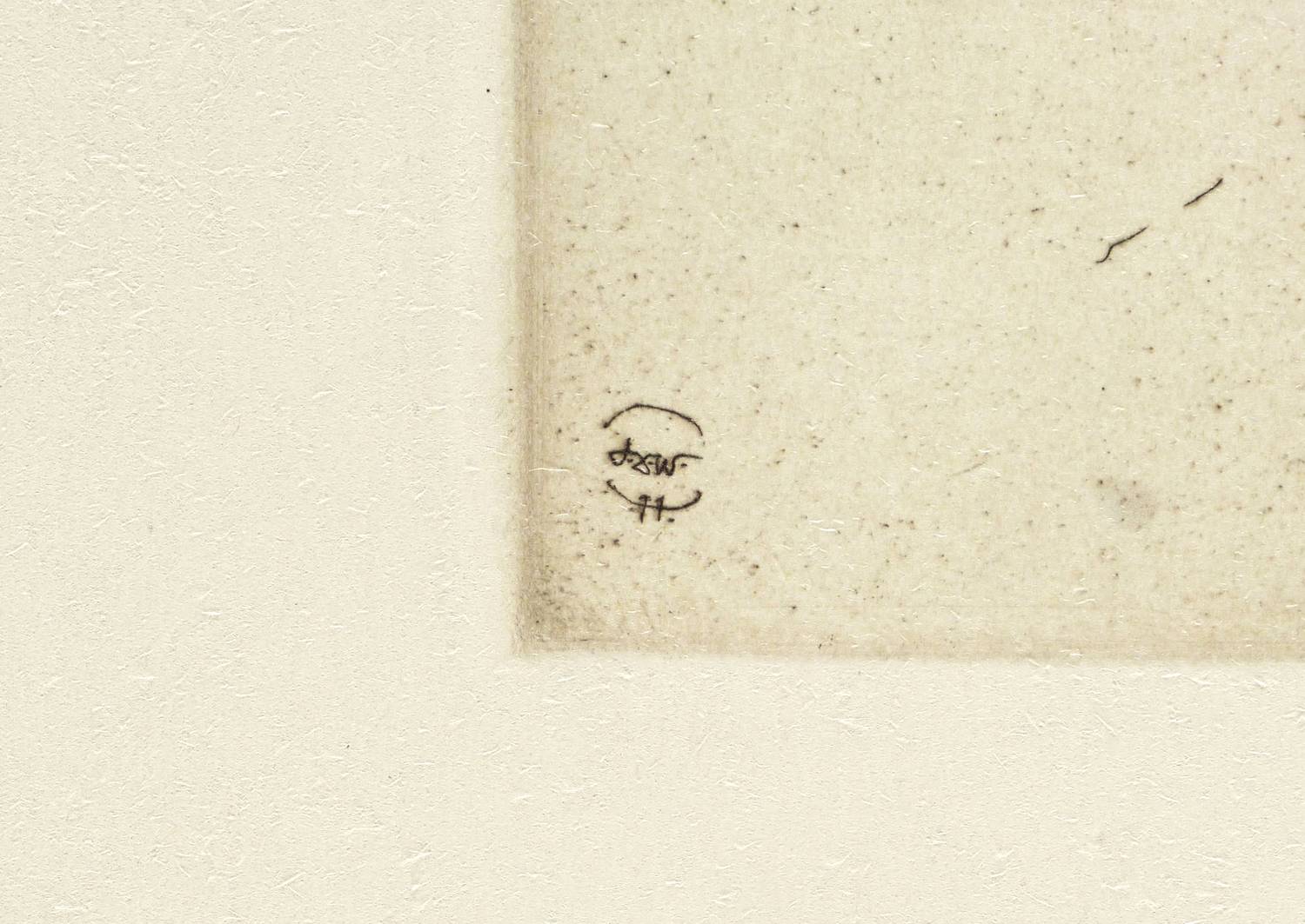 1911. Radierung / Strichätzung, in Schwarzbraun, auf gelbem Kupferdruckkarton. – Originale Künstlergrafik, von Franz Xaver Wimmer. – 12,8 x 18,5 cm (Darstellung / Platte), 24 x 33 cm (Blatt).