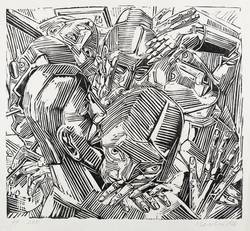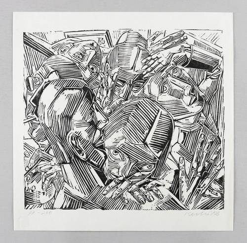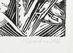 1986. Holzschnitt, in Schwarz, auf hellem Maschinenpapier. – Originale Künstlergrafik, von Rolf Kuhrt. – Auflage Exemplar Nr. 77/200. – 29,6 x 32,8 cm (Darstellung), 36 x 36 cm (Blatt).