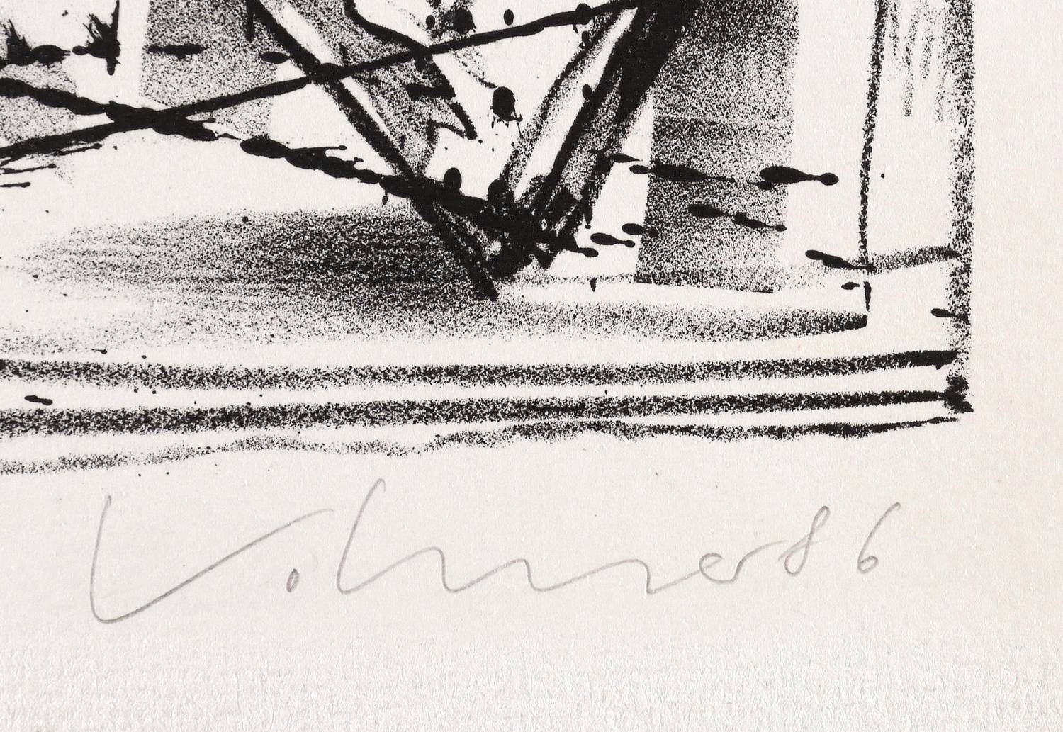 1986. Lithografie / Kreide- & Pinsellithografie, in Schwarz, auf hellgelbem Weißenborn-Bütten. – Originale Künstlergrafik, von Steffen Volmer. – Auflage Exemplar Nr. 77/200. – 30,5 x 31,0 cm (Darstellung), 36 x 36 cm (Blatt).