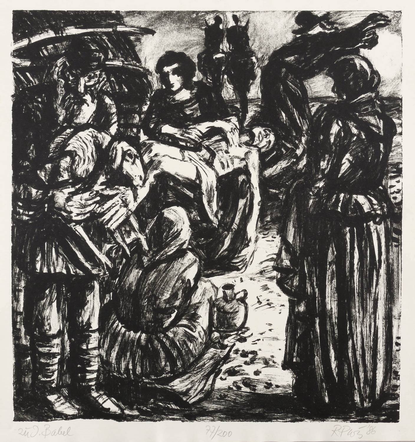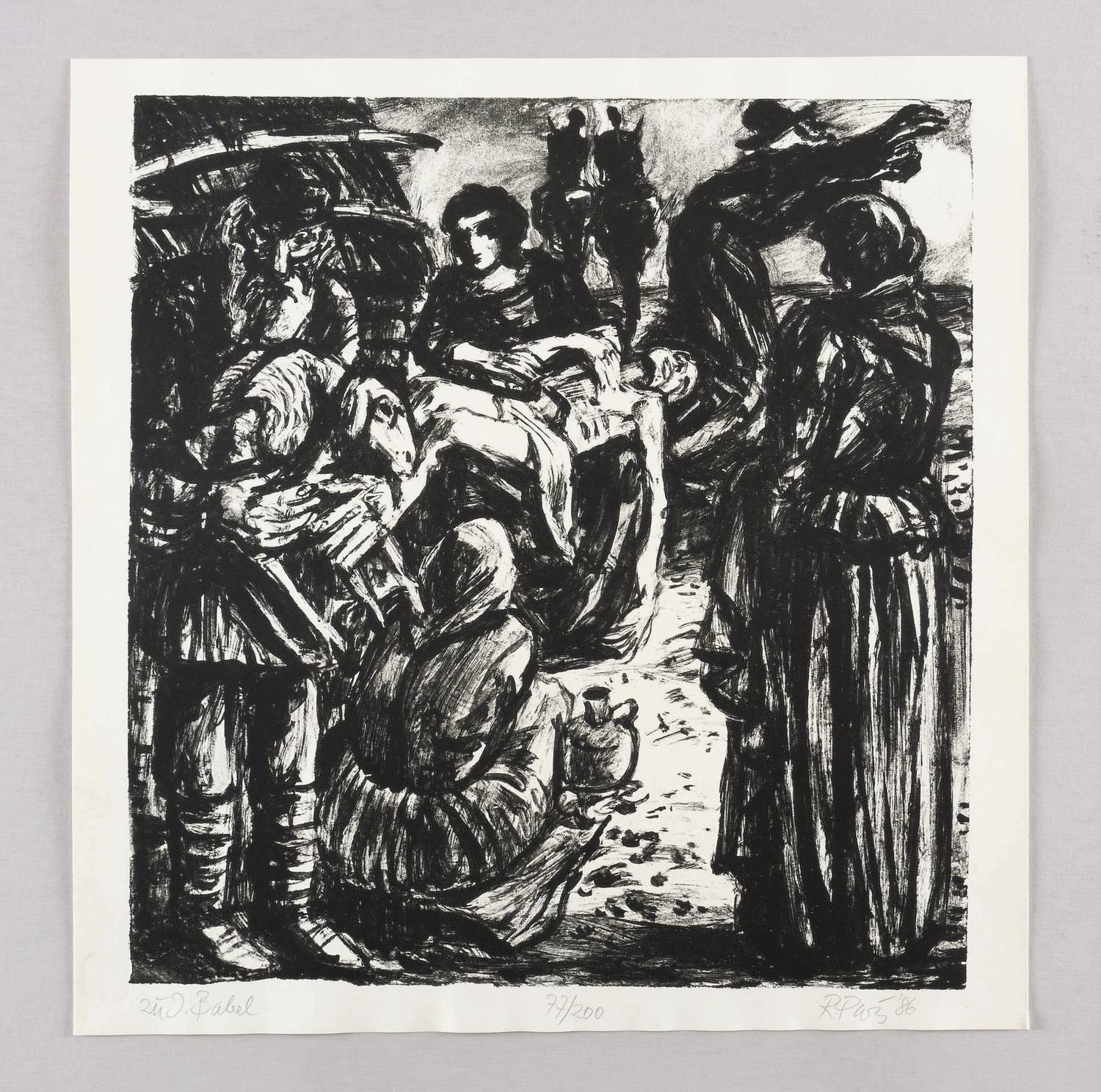 1986. Lithografie / Pinsellithografie, in Schwarz, auf glattem hellchamois Velinkarton. – Originale Künstlergrafik, von Ronald Paris. – Auflage Exemplar Nr. 77/200. – 33,6 x 31,6 cm (Darstellung / Druckbild), 37 x 36 cm (Blatt).
