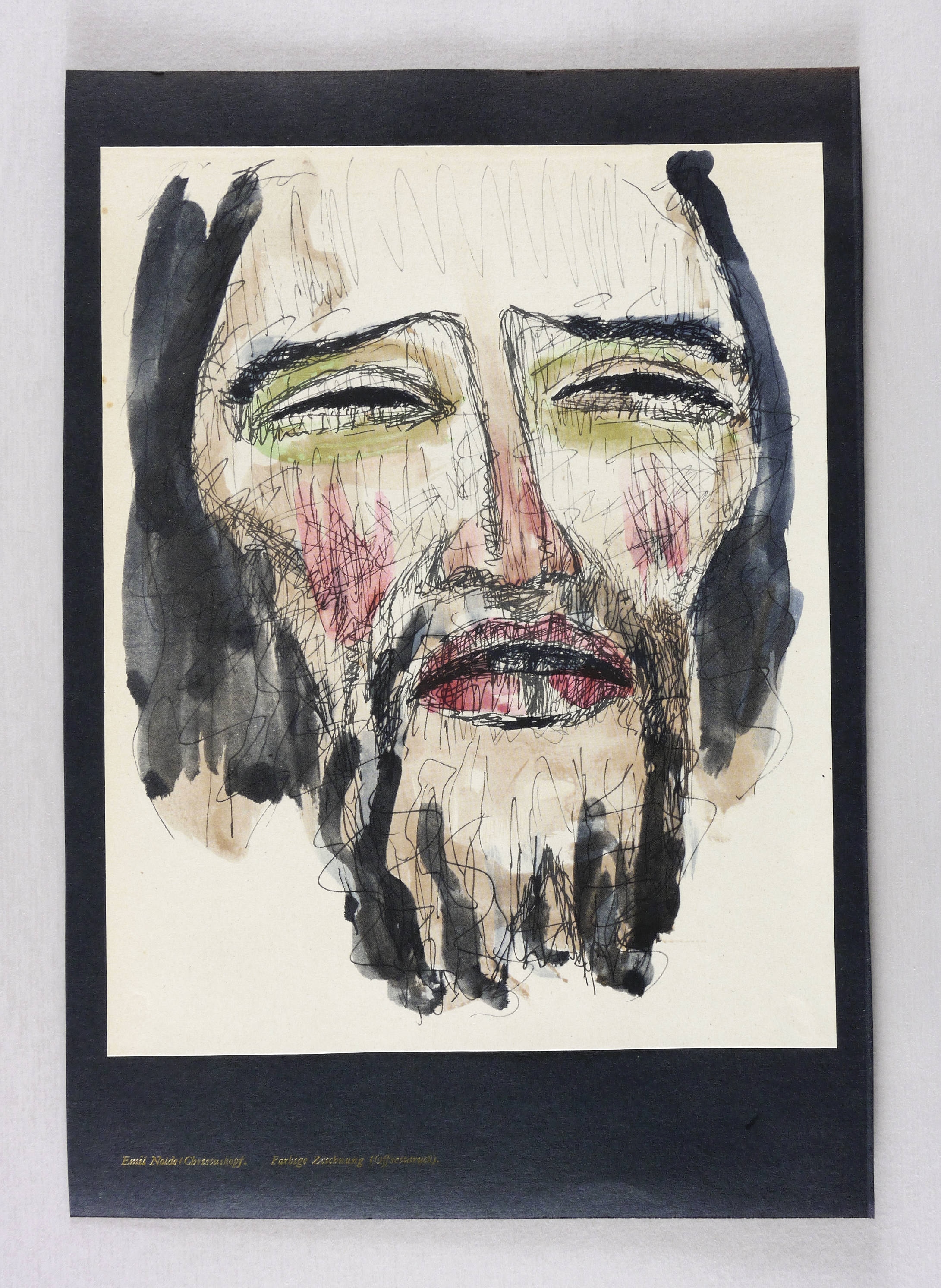 Aus: Genius. Zeitschrift für werdende und alte Kunst (München: Kurt Wolff 1919), Bd. 1. – Nicht handsigniert. Auf dem Trägerkarton unterhalb typografisch bezeichnet: ″Emil Nolde / Christuskopf. Farbige Zeichnung (Offsetdruck).″ Verso in Bleistift bezeichnet: ″Genius I 1919 (Kurt Wolff - Berlin)″. – Originale Farbreproduktion von 1919 nach einer aquarellierten Federzeichnung im damals neuartigen vierfarbigen Offsetdruckverfahren. – Original auf dunklen Trägerkarton gesetzt. Sehr guter Zustand.