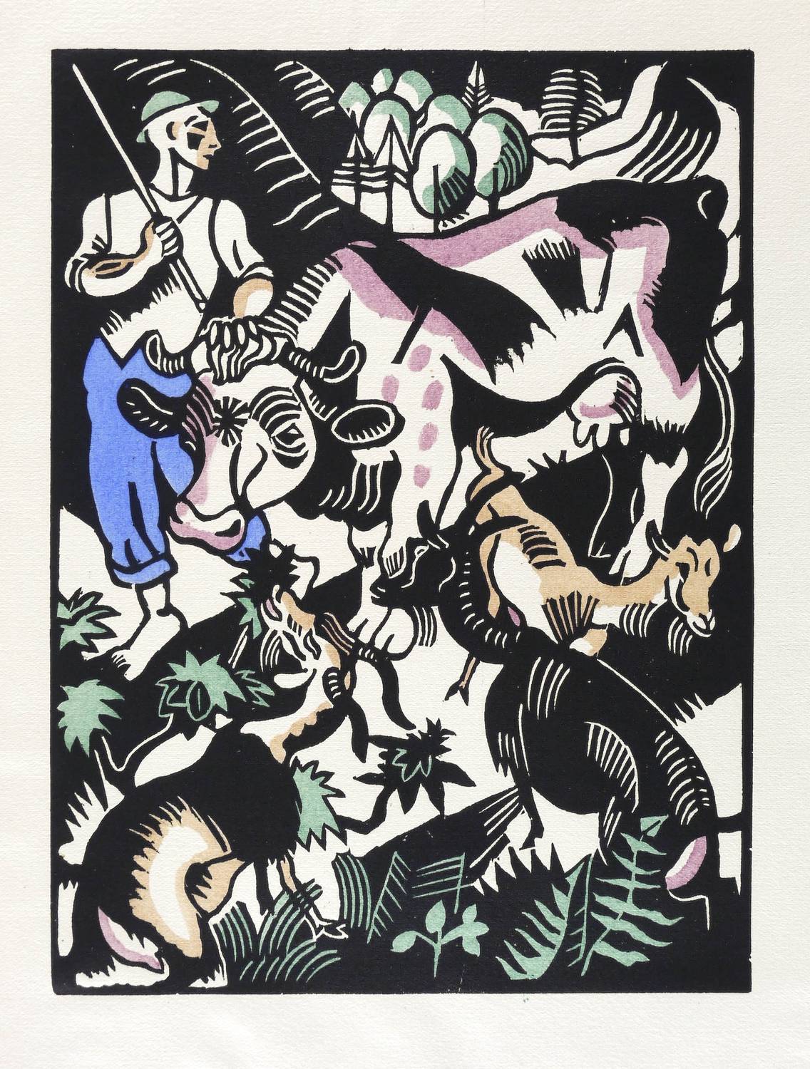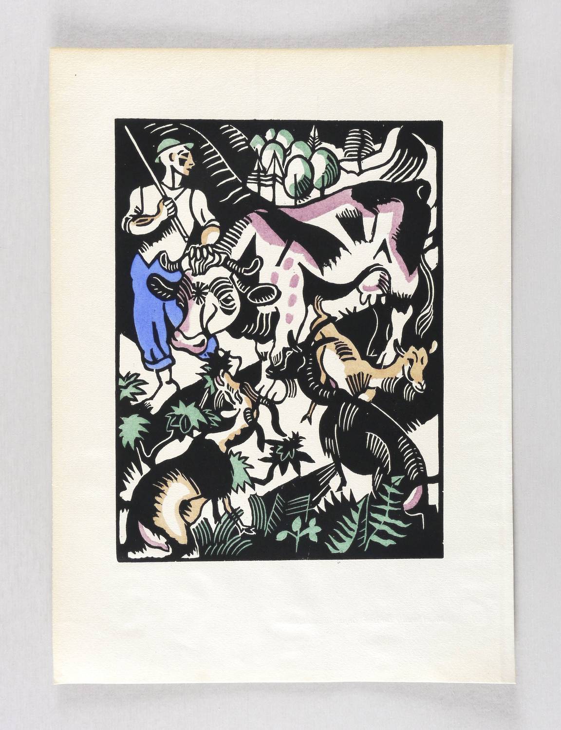 Jentsch H 77 III (von III). – Aus: Genius. Zeitschrift für werdende und alte Kunst (München: Kurt Wolff 1919), Bd. 1. – Verso typografisch bezeichnet: ″Richard Seewald / Der Hirte. Original- Holzschnitt, koloriert.″ – Abdruck vom originalen Holzstock für die erste Ausgabe des Genius von 1919. – Papier minimal gewellt. Insgesamt sehr guter Zustand.