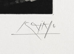 1986. Radierung / Strichätzung & Aquatinta, in Schwarz, auf hellgelbem Weißenborn. – Originale Künstlergrafik, von Gregor Torsten Kozik. – Auflage Exemplar Nr. 77/200. – 18,4 x 26,8 cm (Darstellung / Platte), 36 x 36 cm (Blatt).