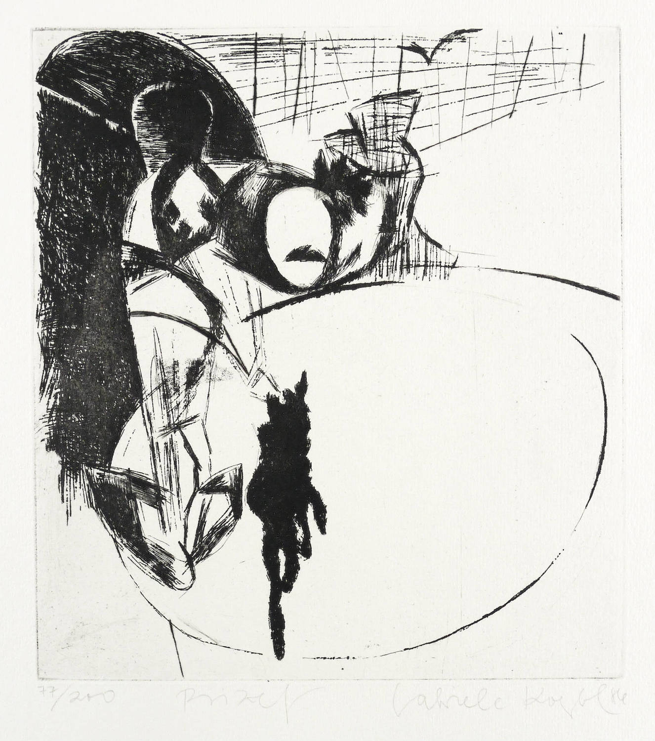 1986. Radierung / Aquatinta & Reservage, in Schwarz, auf hartem hellgelbem Maschinenbütten. – Originale Künstlergrafik, von Gabriele Koerbl. – Auflage Exemplar Nr. 77/200. – 24,8 x 22,4 cm (Darstellung / Platte), 36 x 36 cm (Blatt).