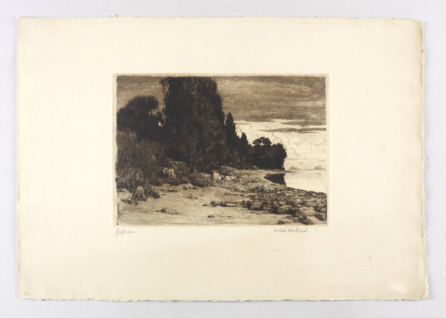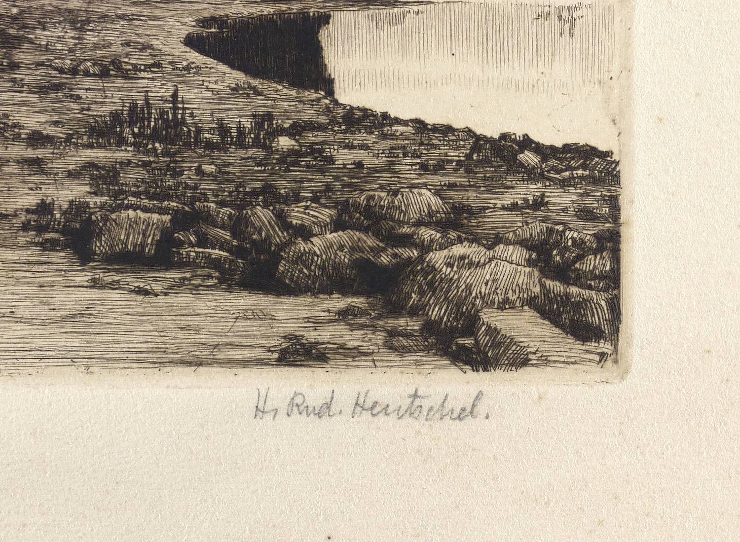 Rechts unten in Bleistift signiert: ″Rudolf Hentschel″. Links Titel: ″Gestade″. – Unbeschnittenes originalrandiges Exemplar. Papier in den Blattkanten altersbedingt leicht gegilbt. Sonst sehr guter Zustand.