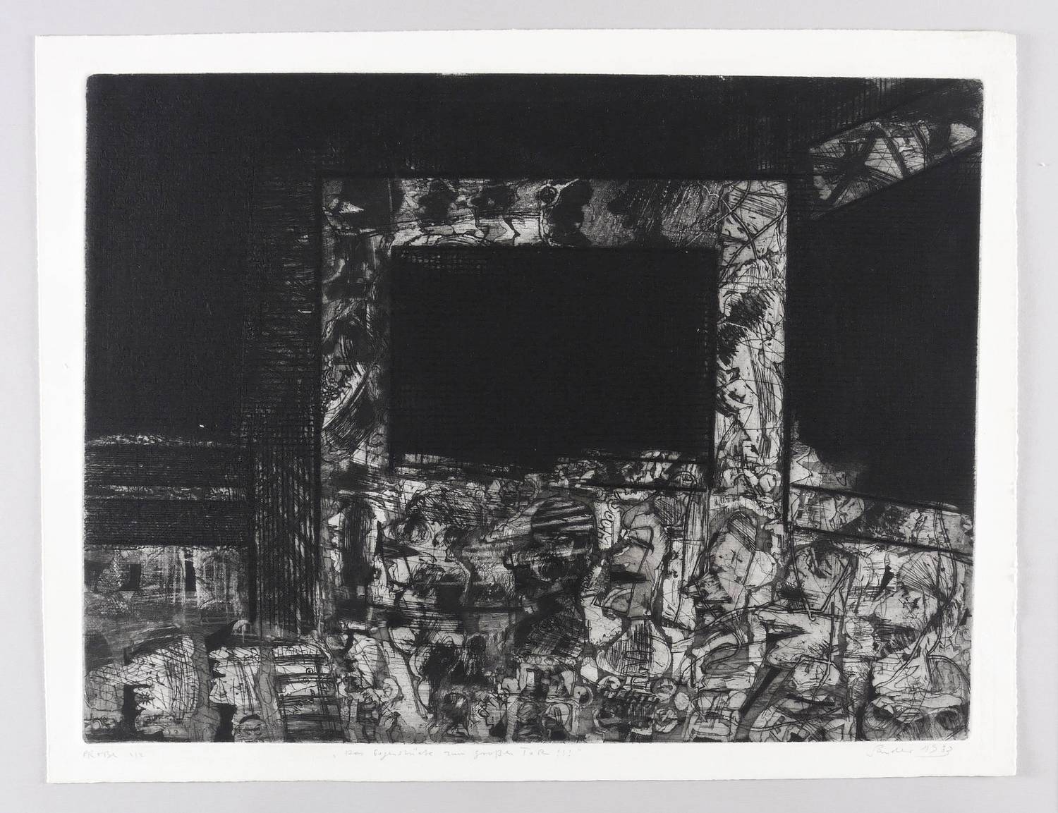 1983. Radierung / Aquatinta & Strichätzung, in Schwarz, auf hellchamois Hahnemühle. – Originale Künstlergrafik, von Otto Sander-Tischbein. – Probedruck Exemplar Nr. 2/2. – 47,8 x 63,4 cm (Darstellung / Druckbild), 54 x 70 cm (Blatt).