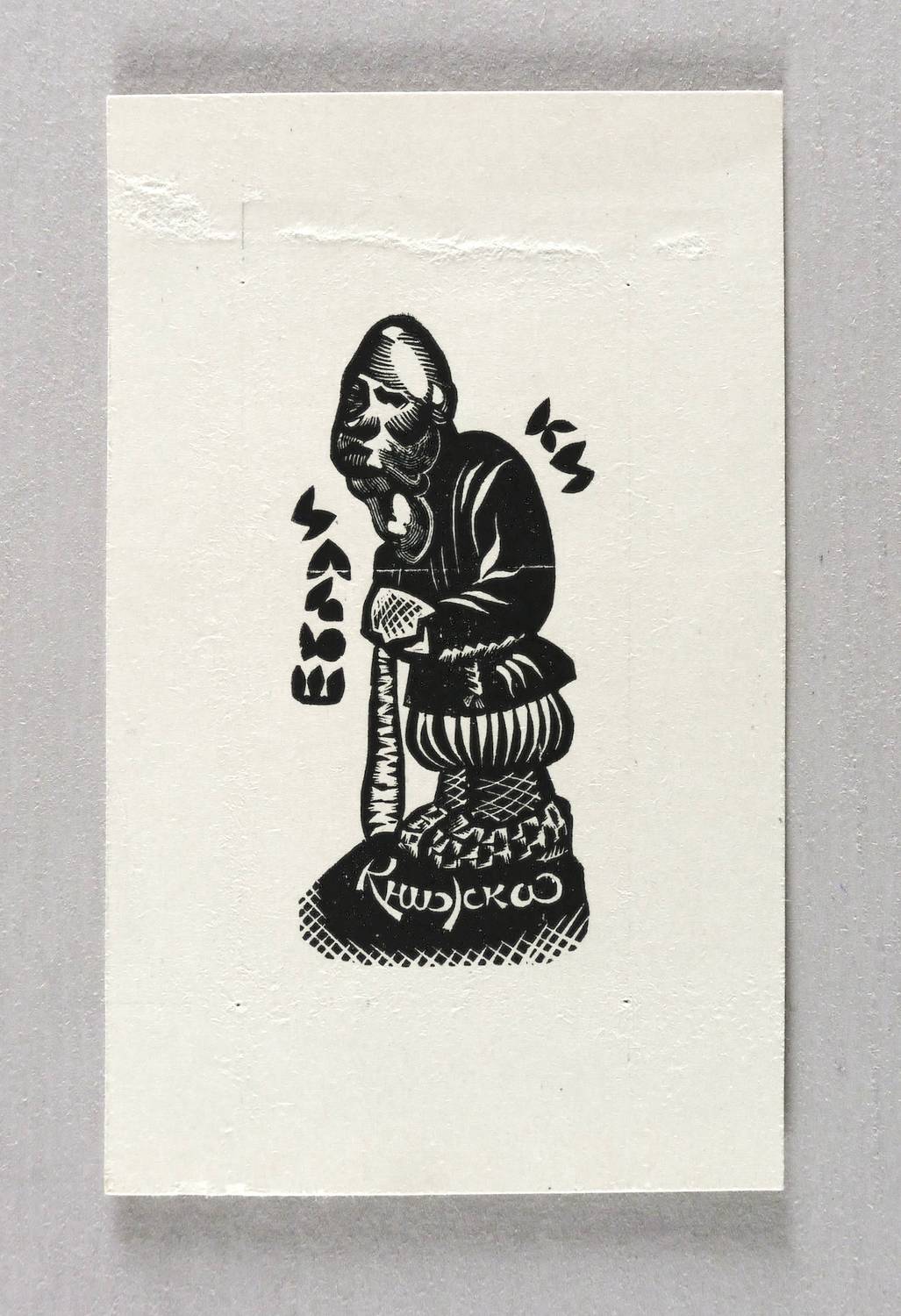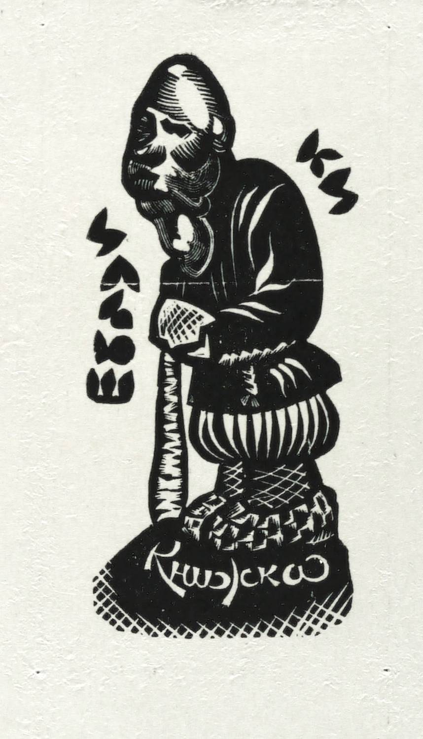 Um 1960. Holzschnitt, in Schwarz, auf hellgelbem Velin. – Exlibris, von Nikolaj Vasilevic Burmagin. – 6,2 x 2,8 cm (Darstellung / Druckstock), 10,4 x 6,3 cm (Blatt).