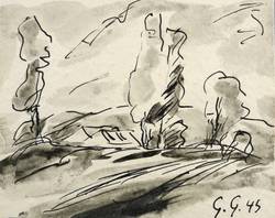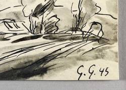 1945. Zeichnung / Federzeichnung, in schwarzer Tusche, grau laviert, auf Karton. – Originale Künstlergrafik, von Georg Gelbke. – Unikat. – 11,1 x 13,7 cm (Darstellung / Blatt).