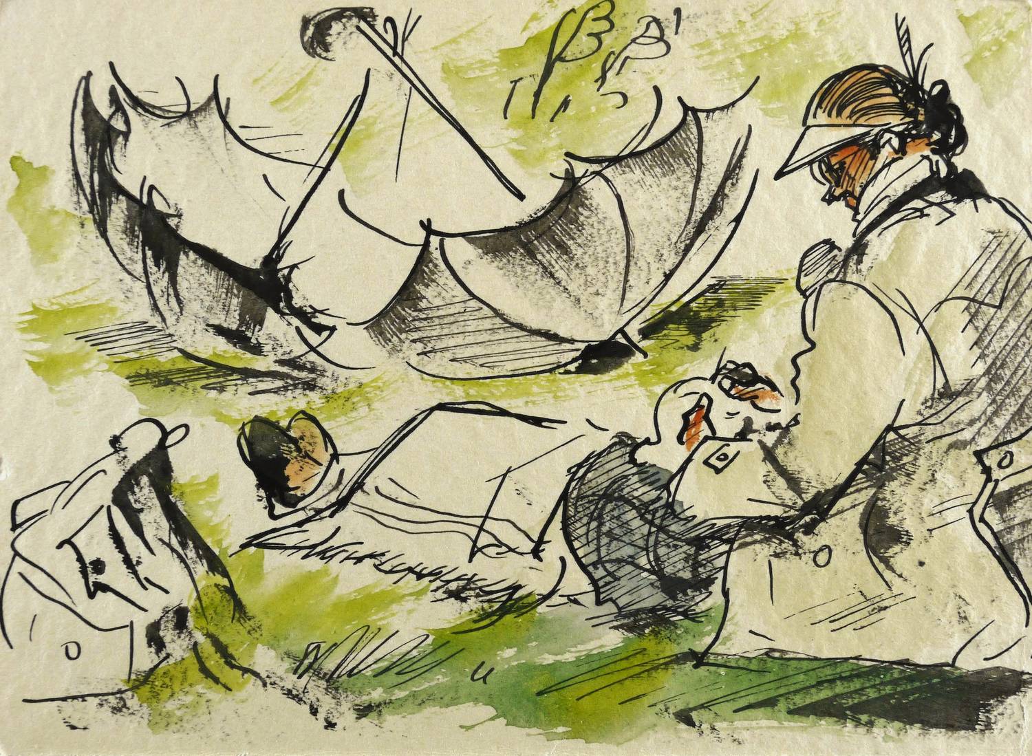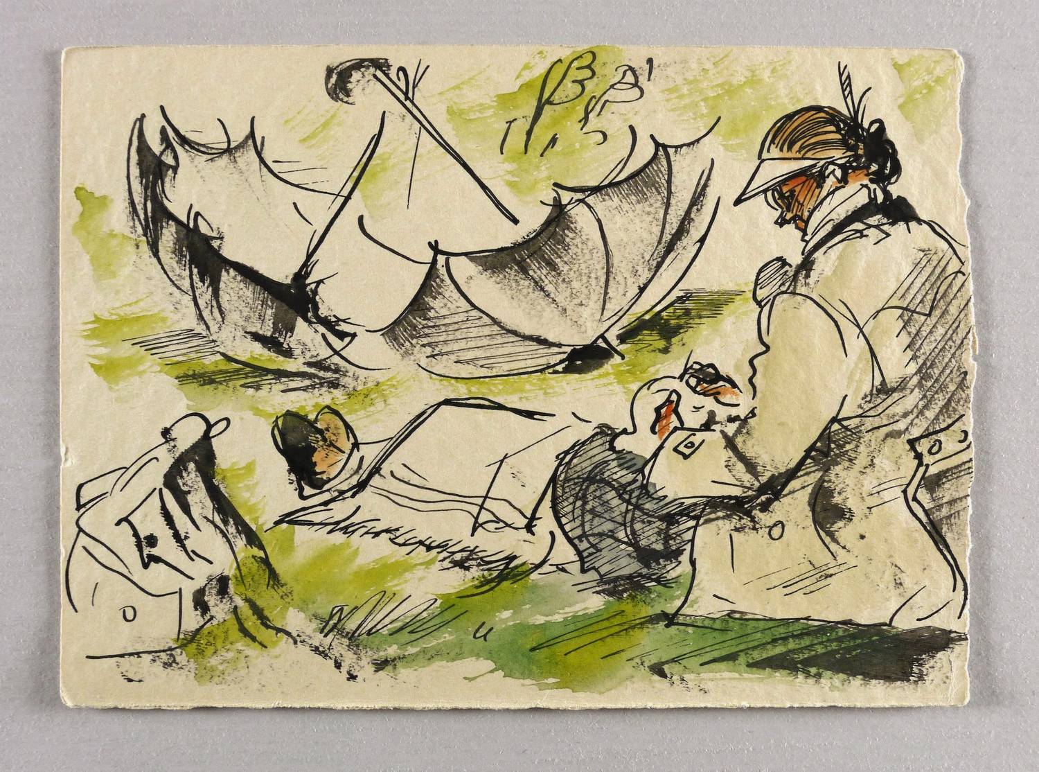 1937. Zeichnung / Federzeichnung, in schwarzer Tusche, aquarelliert, auf hellgelbem Karton. – Originale Künstlergrafik, von Georg Gelbke. – Unikat. – 10,2 x 14,8 cm (Darstellung / Blatt).