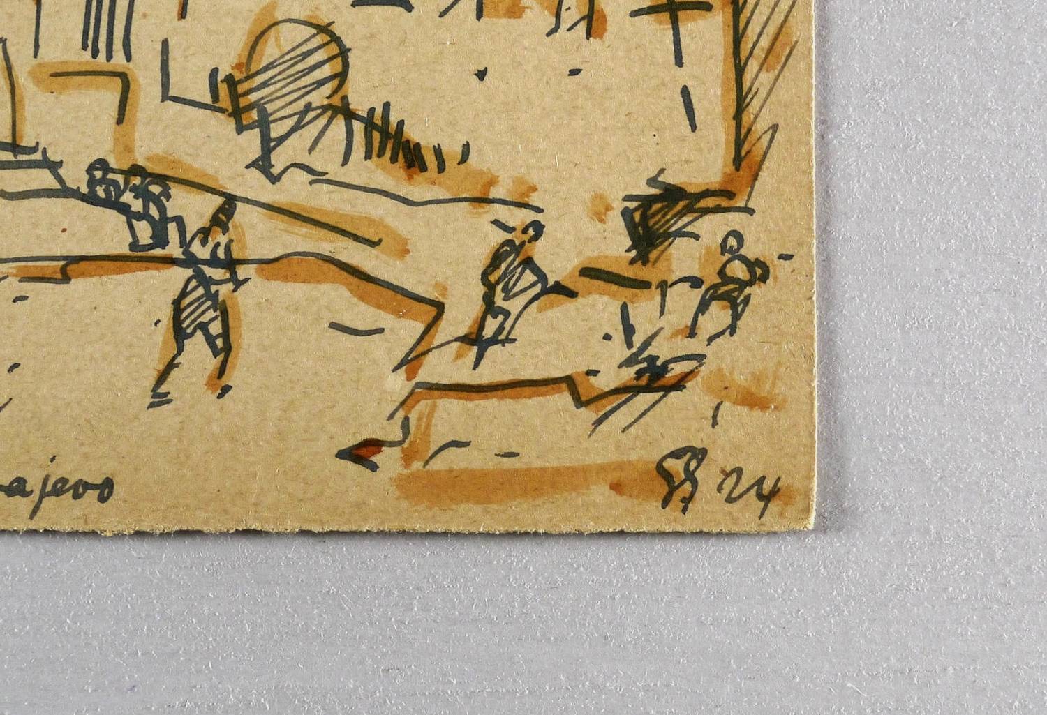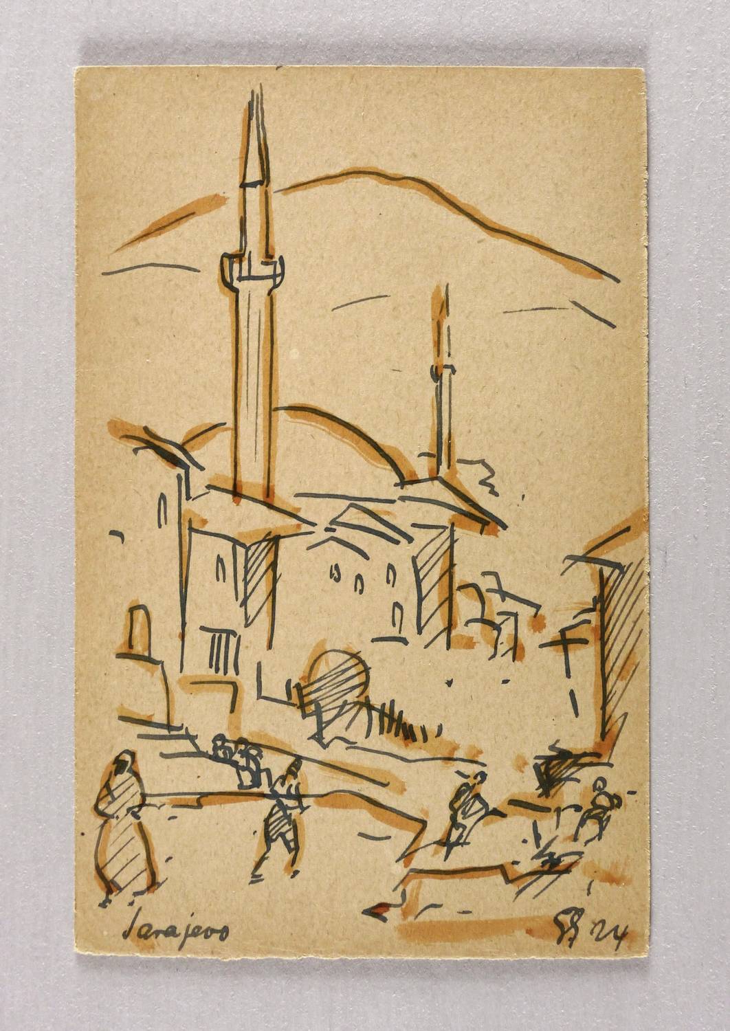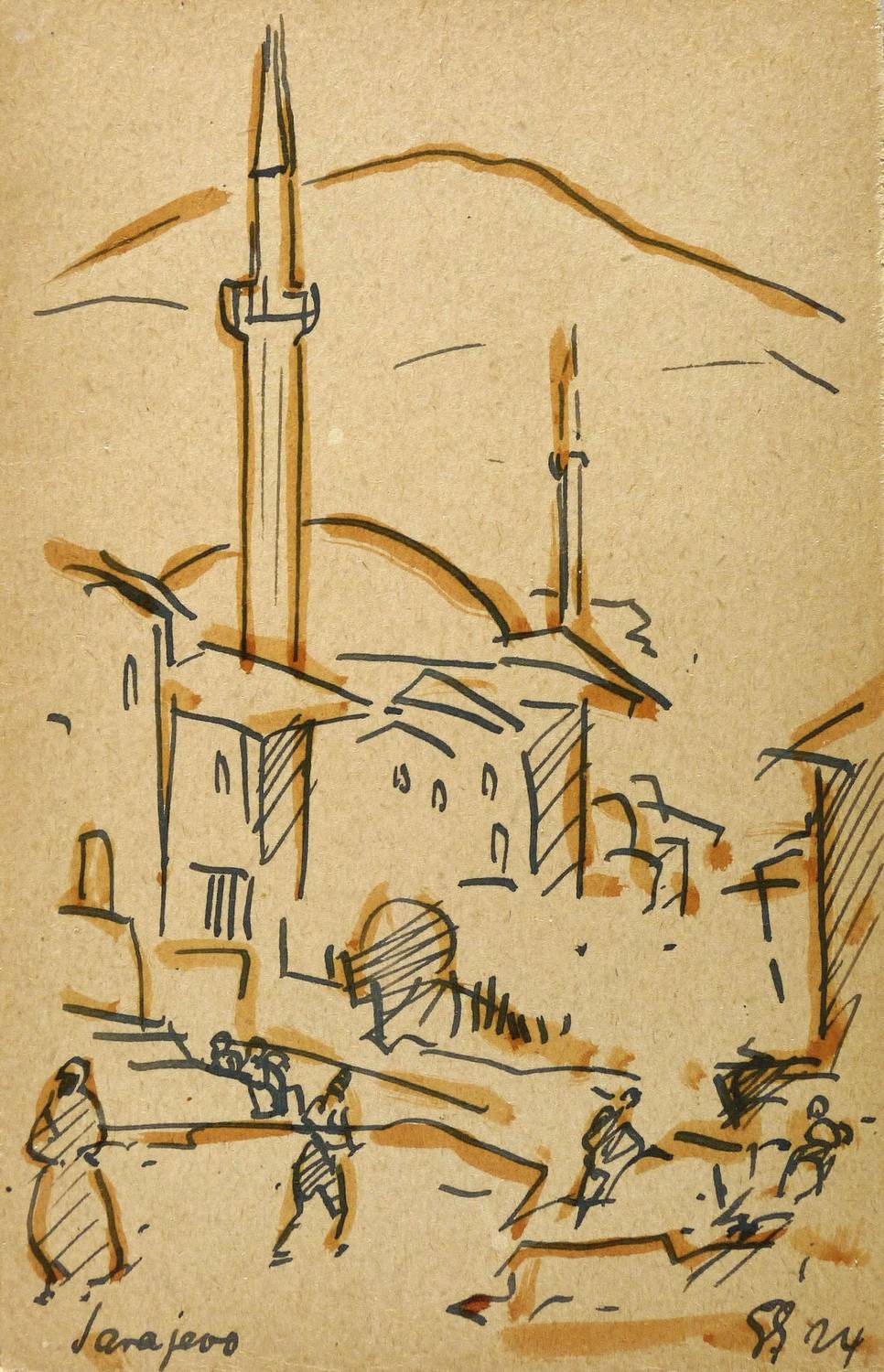 Rechts unten in schwarzer Feder signiert und datiert: ″G.G. 24″. Links bezeichnet: ″Sarajevo″. Verso Schreiben von Coelestine Gelbke an die Eltern Dr. Theodor Arndt und Frau in Dresden: ″II // Zille könnte hier Material sammeln für neue Zoten. Mein Haase läßt Euch herzlich grüßen u. auch seinerseits den tiefgefühlten Dank seiner Künstlerseele zu Füßen legen. 'Dobar dan' sagt er mit Zungen-R wie ein Alter u. es kann dan´bei keiner ihm den Deutschen noch den Sachsen anmerken. Mein Italienisch hat mich hier gerettet, - es wäre sonst ganz [...] gewesen. [...]″ – Provenienz: Dresdner Privatbesitz, ehemals Sammlung Dr. Theodor Arndt, Dresden- Blasewitz (Vater der Ehefrau des Künstlers Coelestine). – Sehr guter Zustand.