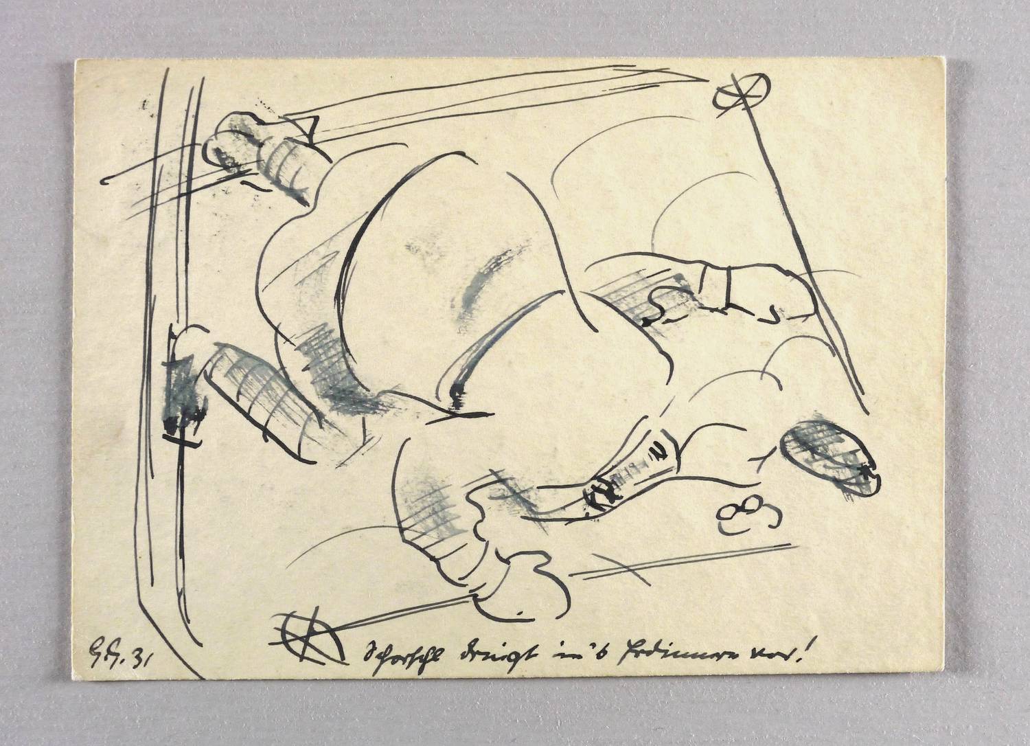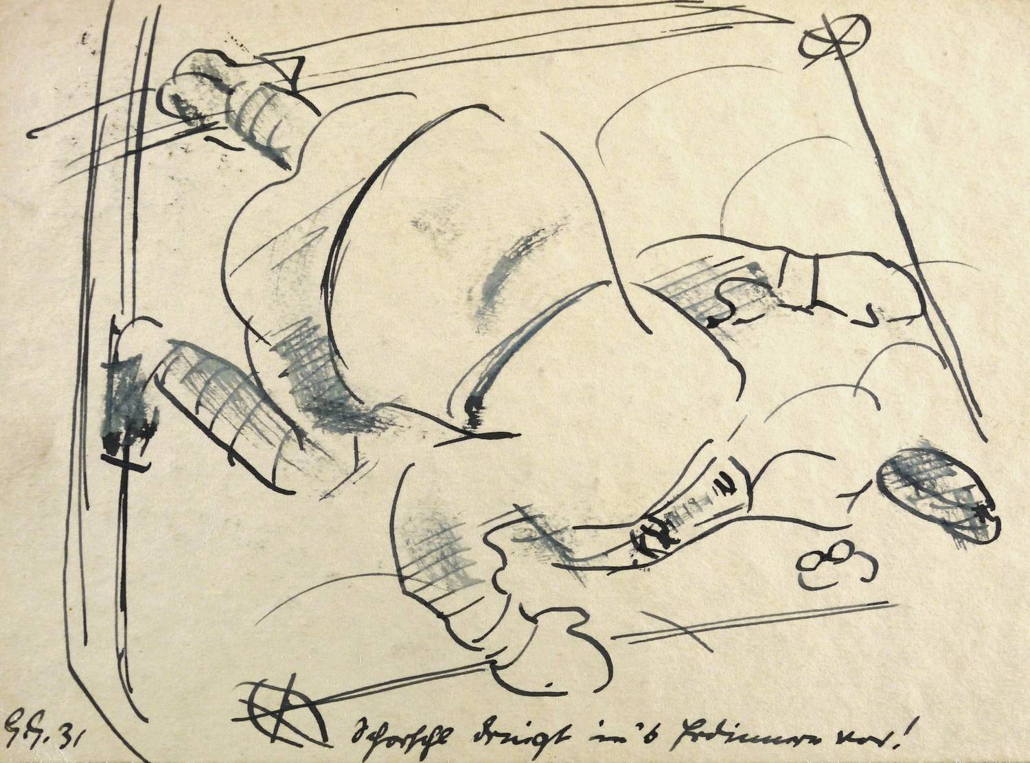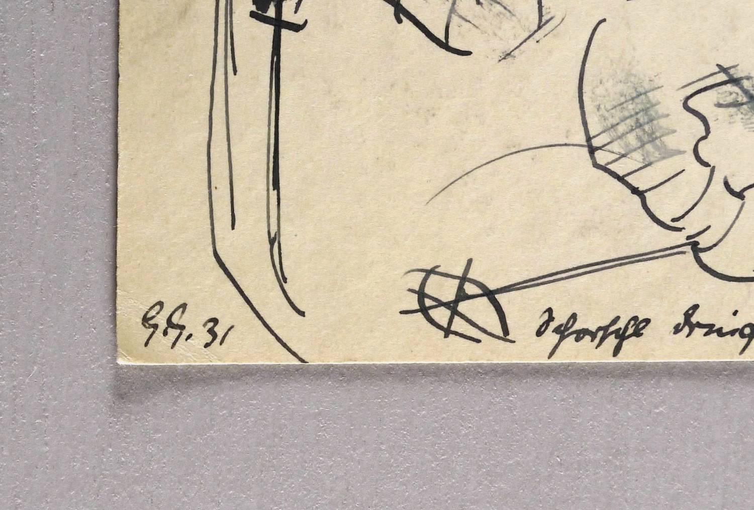 Links unten in schwarzer Feder signiert und datiert: ″G.G. 31″ Rechts bezeichnet: ″Schorschl dringt in's Erdinnere vor!″. – Provenienz: Dresdner Privatbesitz, ehemals Sammlung Dr. Theodor Arndt, Dresden- Blasewitz (Vater der Ehefrau des Künstlers Coelestine). – Sehr guter Zustand.