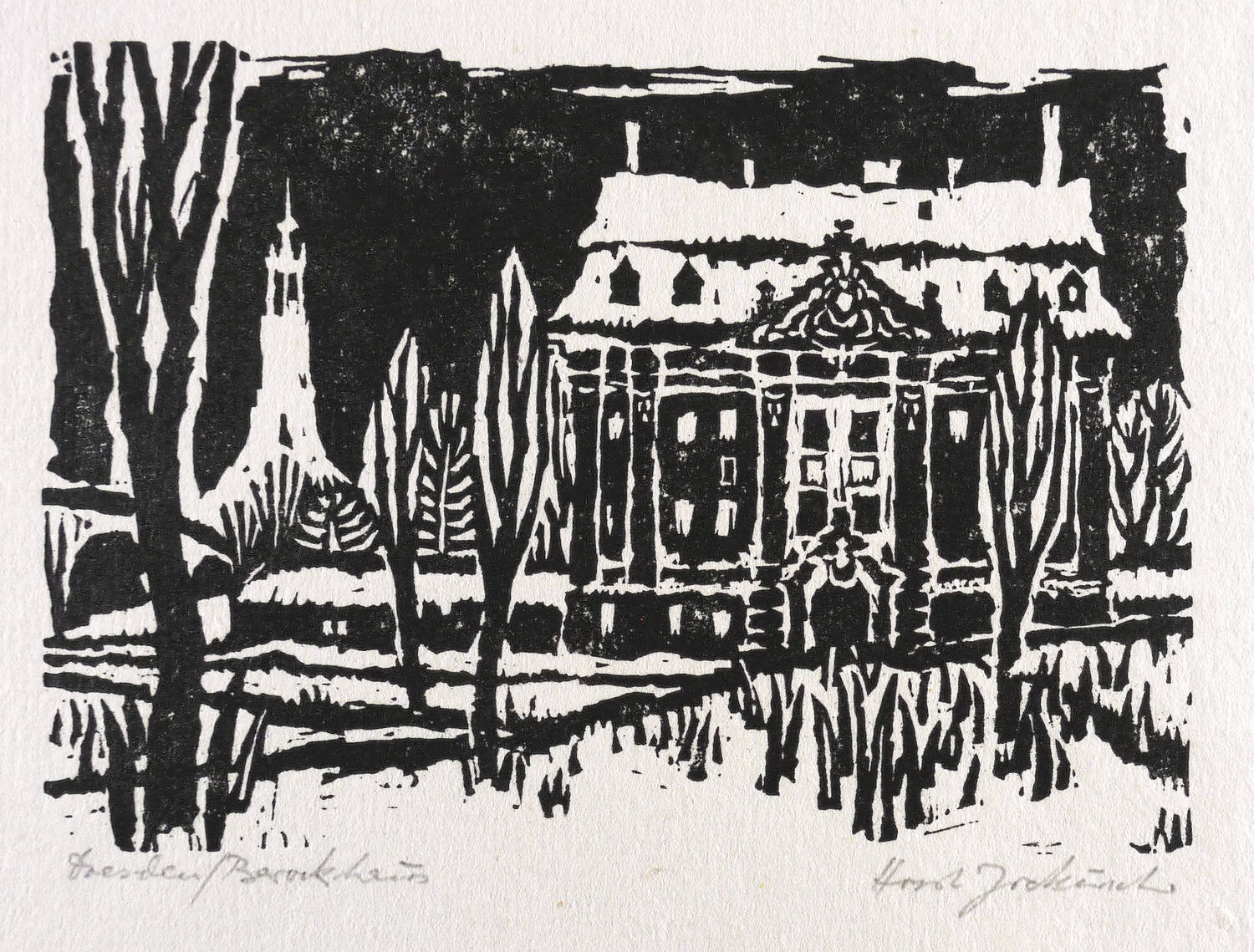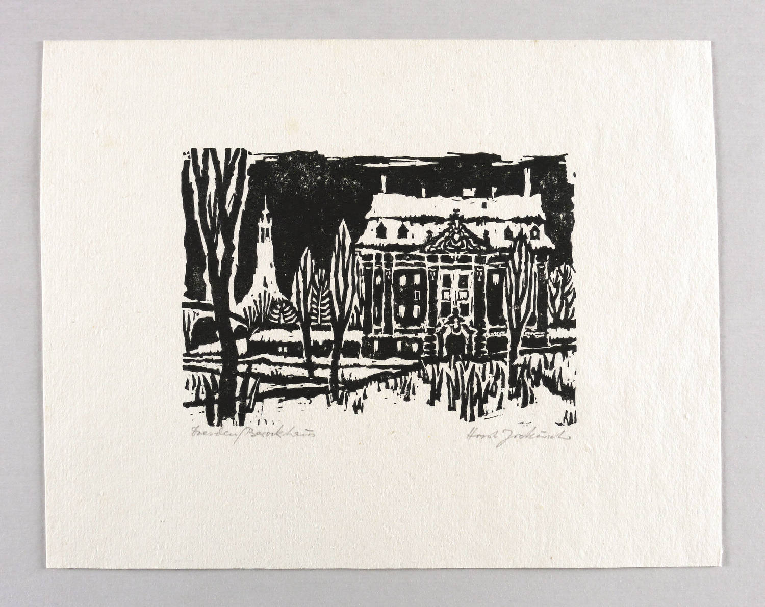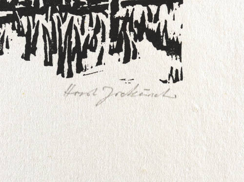 Um 1965. Holzschnitt, in Schwarz, auf wolkigem hellchamois Velin. – Originale Künstlergrafik, von Horst Jockusch. – 12,0 x 16,7 cm (Darstellung), 23 x 29 cm (Blatt).
