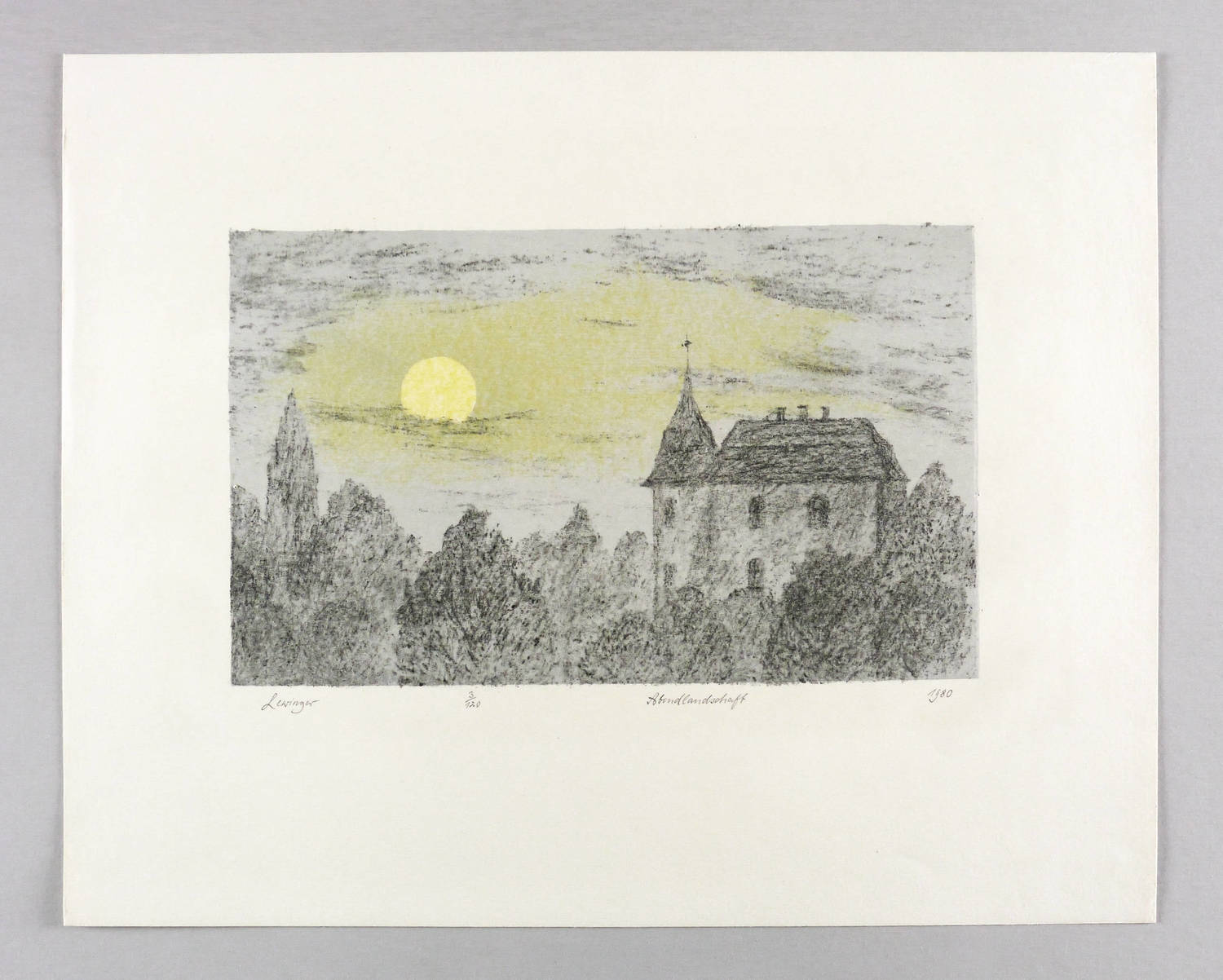 1980. Lithografie / Kreidelithografie, in Schwarz, aquarelliert, auf hellchamois Weißenborn. – Originale Künstlergrafik, von Ernst Lewinger. – Auflage Exemplar Nr. 3/120. – 18,8 x 30,7 cm (Darstellung / Druckbild), 36 x 45 cm (Blatt).