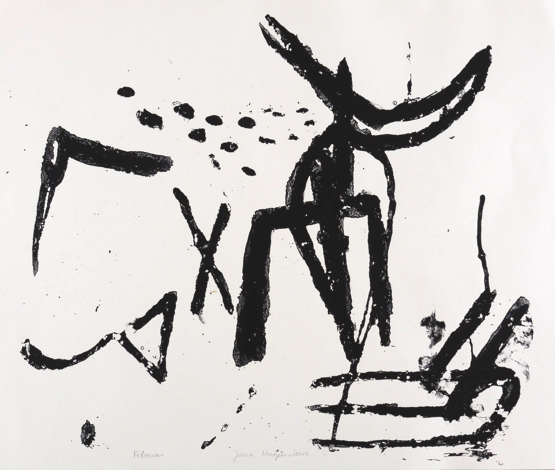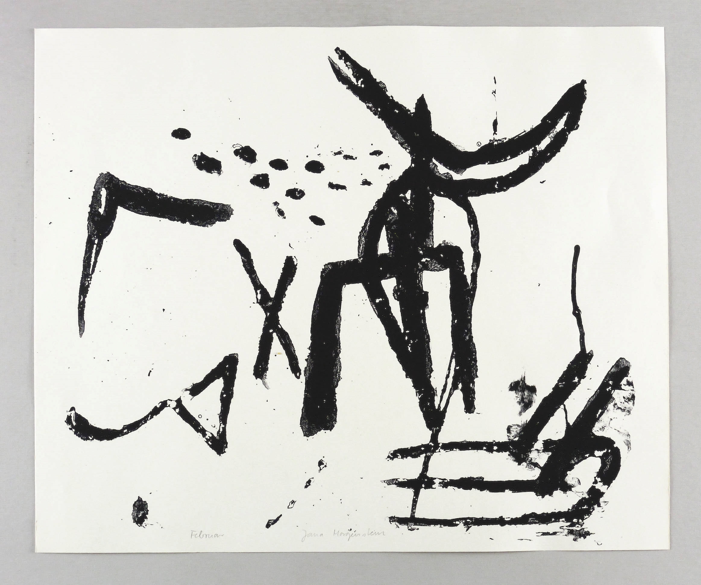 1994. Siebdruck / Serigrafie, in Schwarz, auf hellgelbem Werkdruckpapier. – Originale Künstlergrafik, von Jana Morgenstern. – Auflage Exemplar Nr. 8/120. – 38,5 x 45,2 cm (Darstellung / Druckbild), 42 x 50 cm (Blatt).