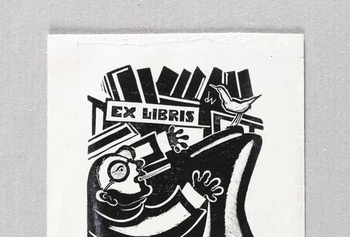Um 1950. Holzschnitt, in Schwarz, auf leichtem hellgelbem Velin. – Exlibris, von Cor de Wolff. – 6,8 x 4,9 cm (Darstellung / Druckstock), 9,8 x 7,3 cm (Blatt).
