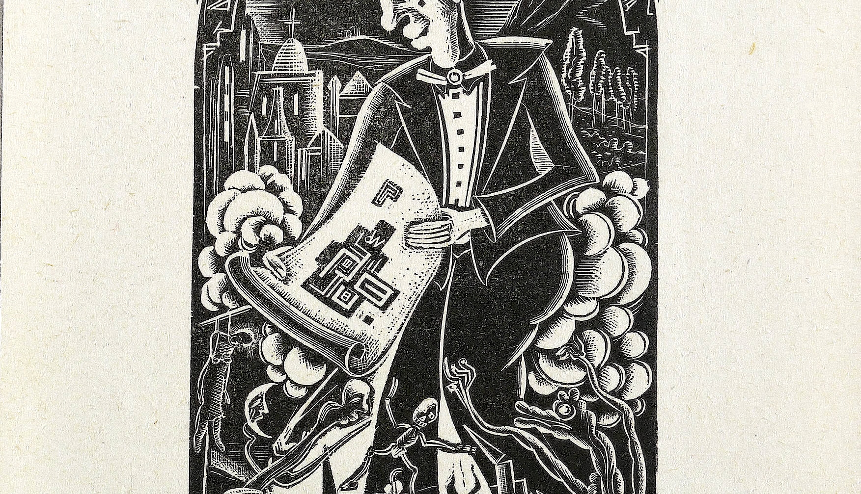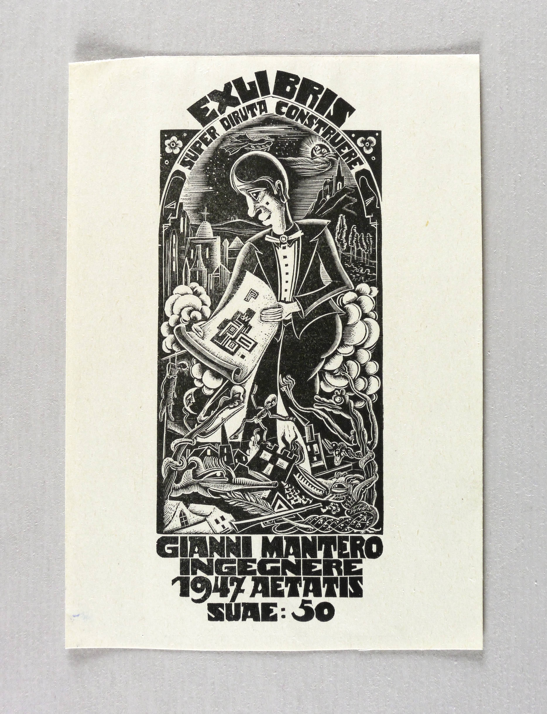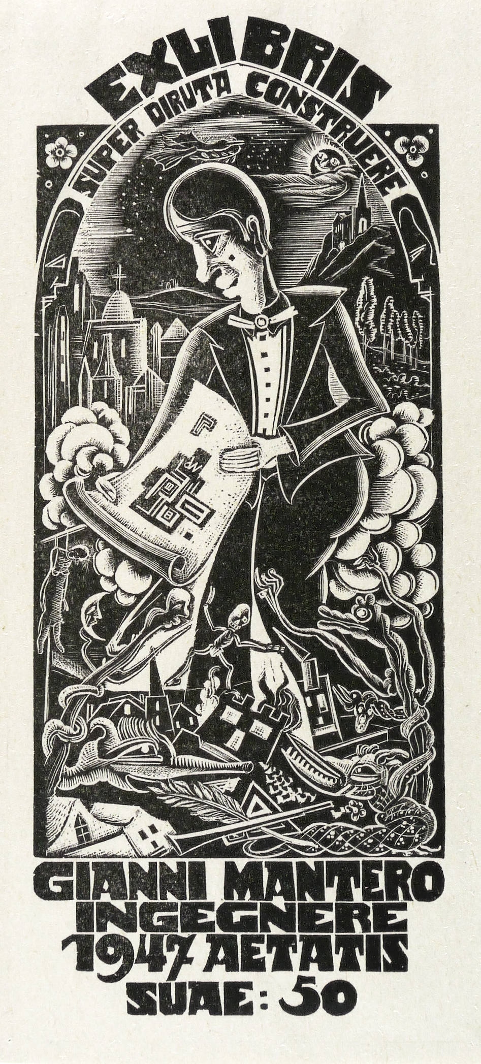 Im Druckstock ligiertes Monogramm: ″dW″. Inschrift: ″EXLIBRIS / SUPER DIRUTA CONSTRUERE // GIANNI MANTERO / INGEGNERE / 1947 AETATIS SUAE: 50″. – Sehr guter Zustand.