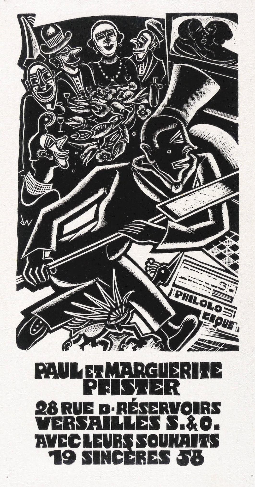 Im Druckstock ligiertes Monogramm: ″dW″. Inschrift: ″PHILOLOGIQUE // PAUL ET MARGUERITE PFISTER / 28 RUE D'RESERVOIRS / VERSAILLES S. & O. / AVEC LEURS SOUHAITS / 19 SINCÉRES 58″. – Oberhalb leichte Montagespur. Guter Zustand.