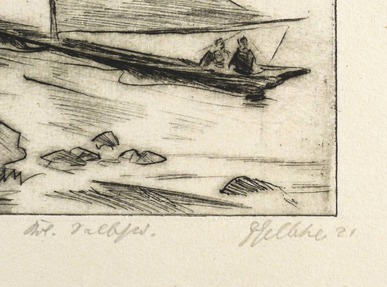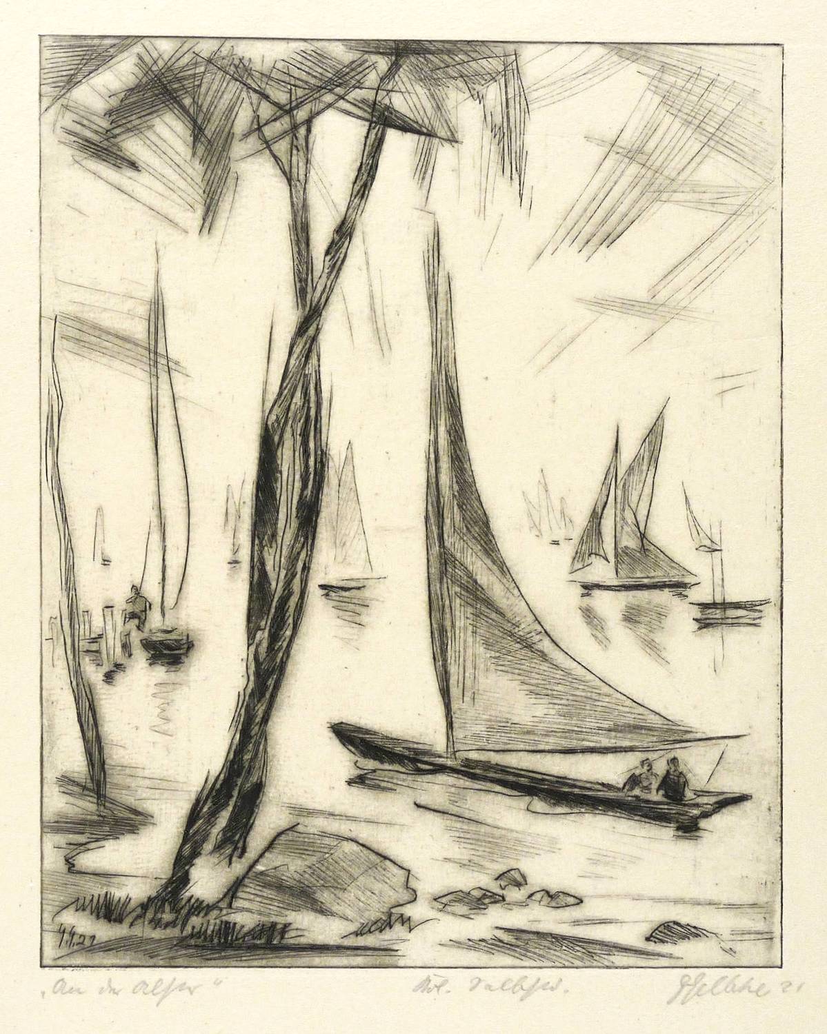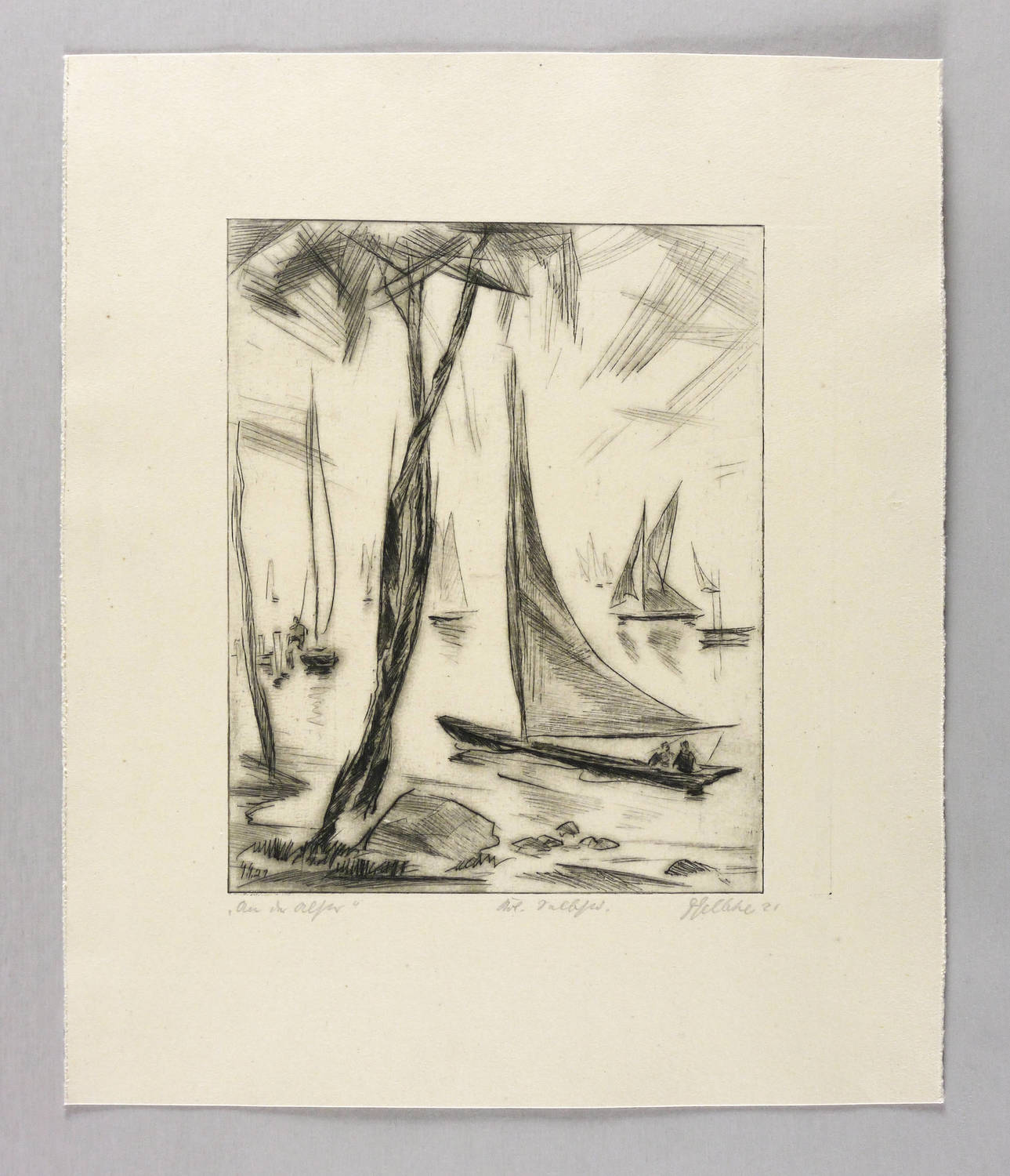 Rechts unten in Bleistift signiert und datiert: ″G Gelbke 21″. Links Titel: ″An der Alster″. Mittig bezeichnet: ″Kol. Selbstdr.″ – Selbstdruck des Künstlers. – Sehr guter Zustand.