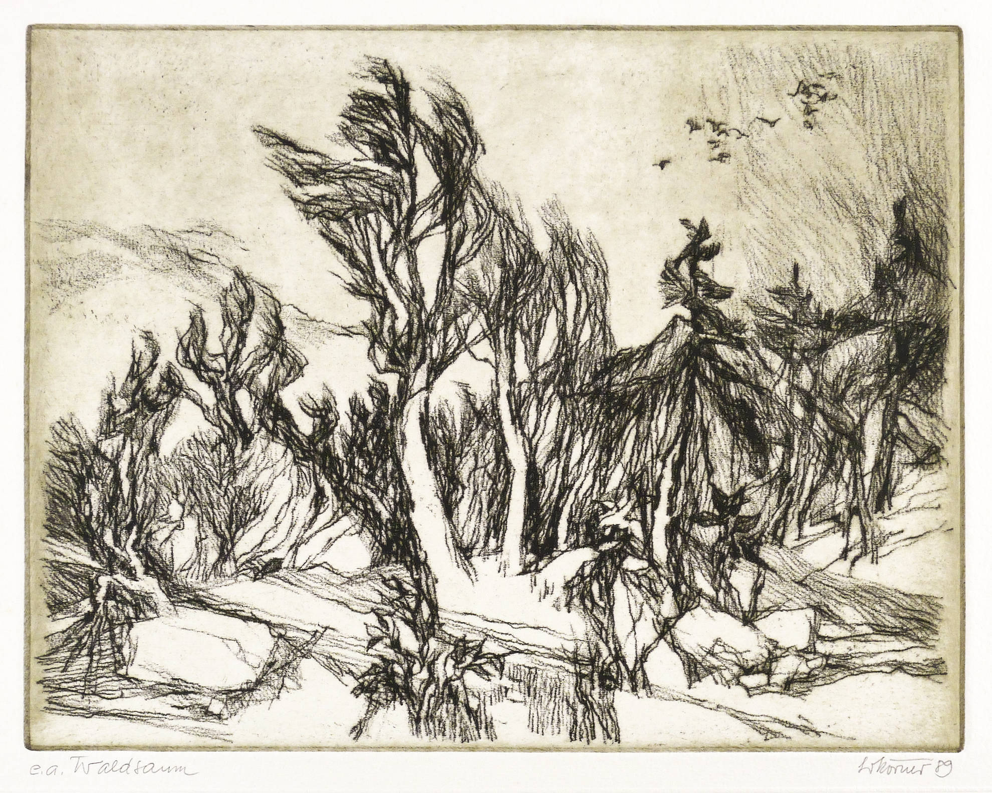 1989. Radierung / Vernis mou, mit Plattenton, in Schwarz, auf hellchamois Velinkarton. – Originale Künstlergrafik, von Gottfried Körner. – Künstlerexemplar (e.a.). – 24,0 x 31,2 cm (Darstellung / Platte), 42 x 40 cm (Blatt).