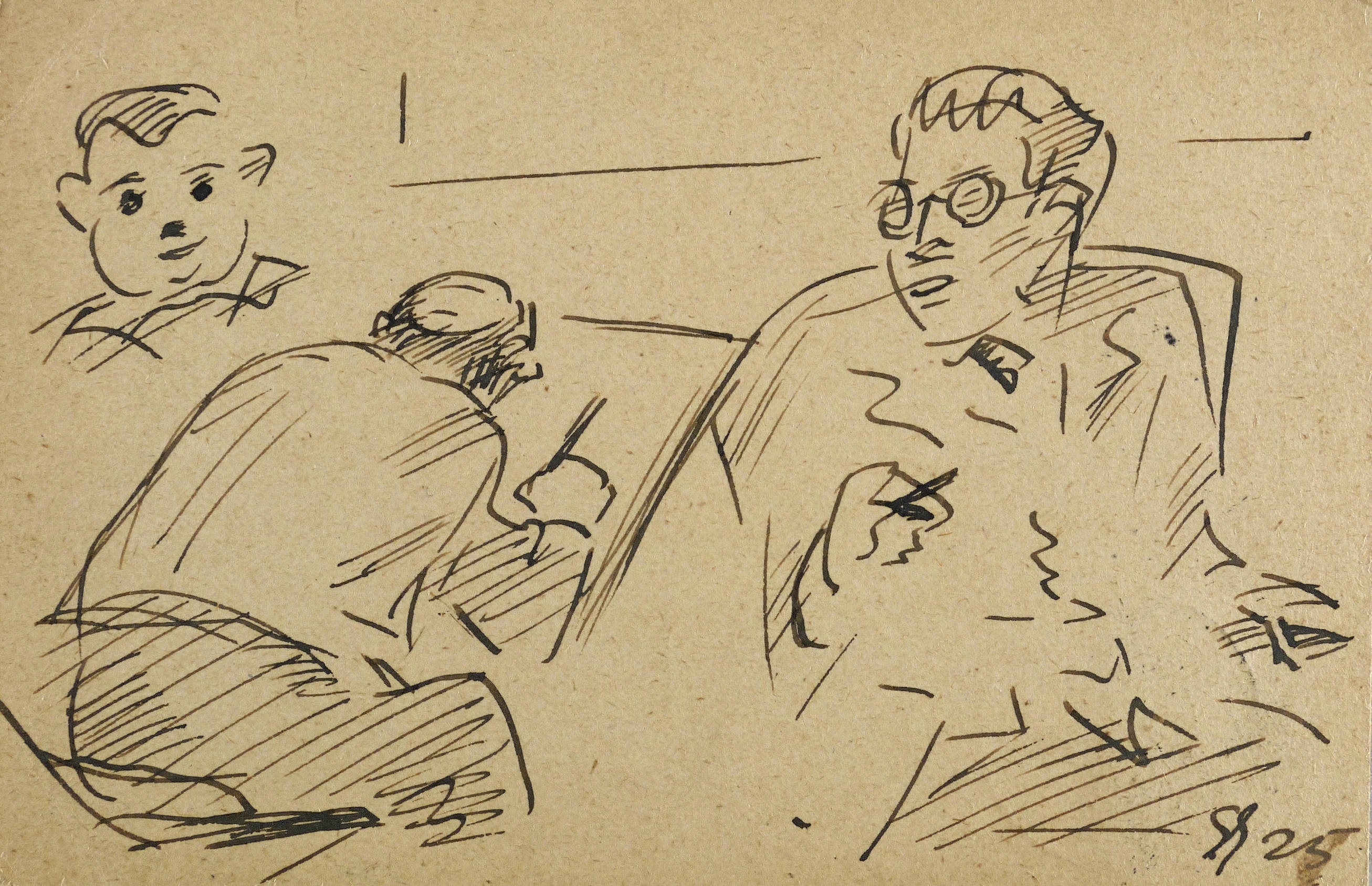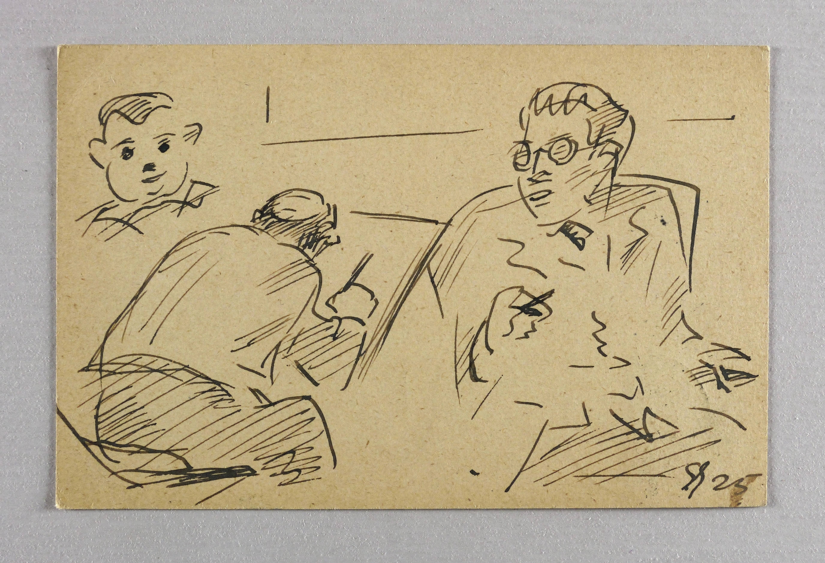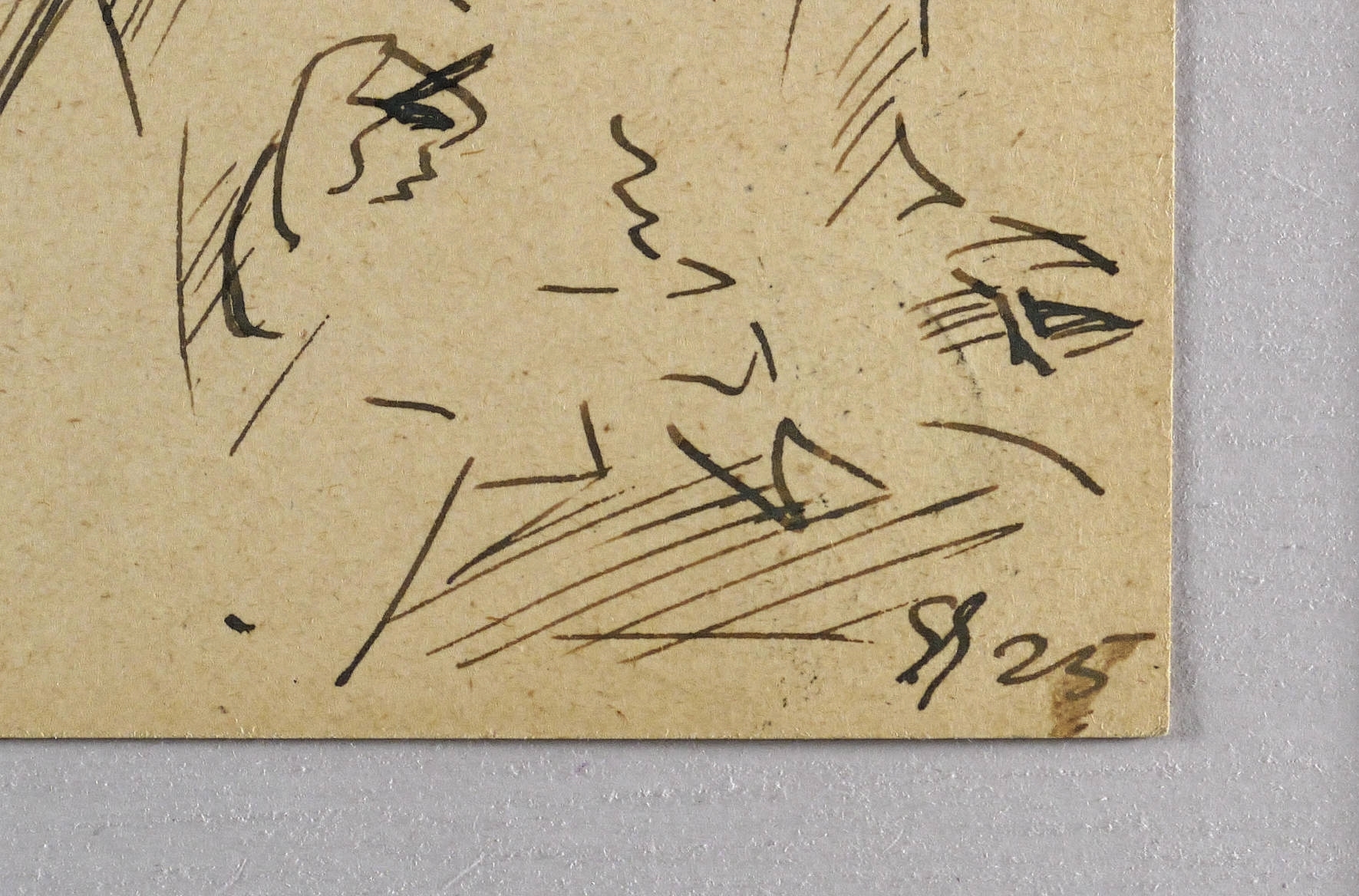 1925. Zeichnung / Federzeichnung, in schwarzer Tusche, auf gelbem Postkarten-Karton. – Originale Künstlergrafik, von Georg Gelbke. – Unikat. – 9,1 x 14,0 cm (Darstellung / Blatt).