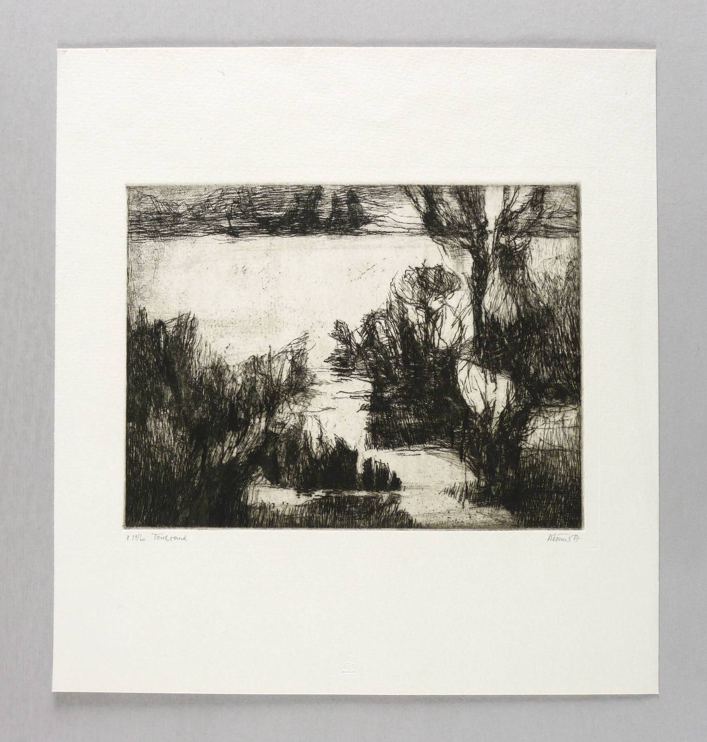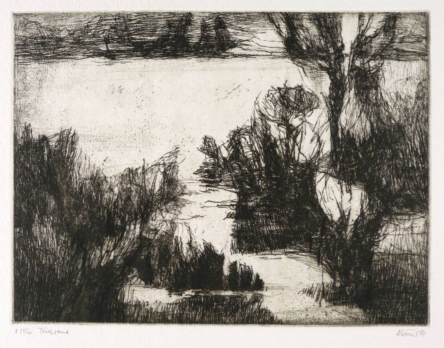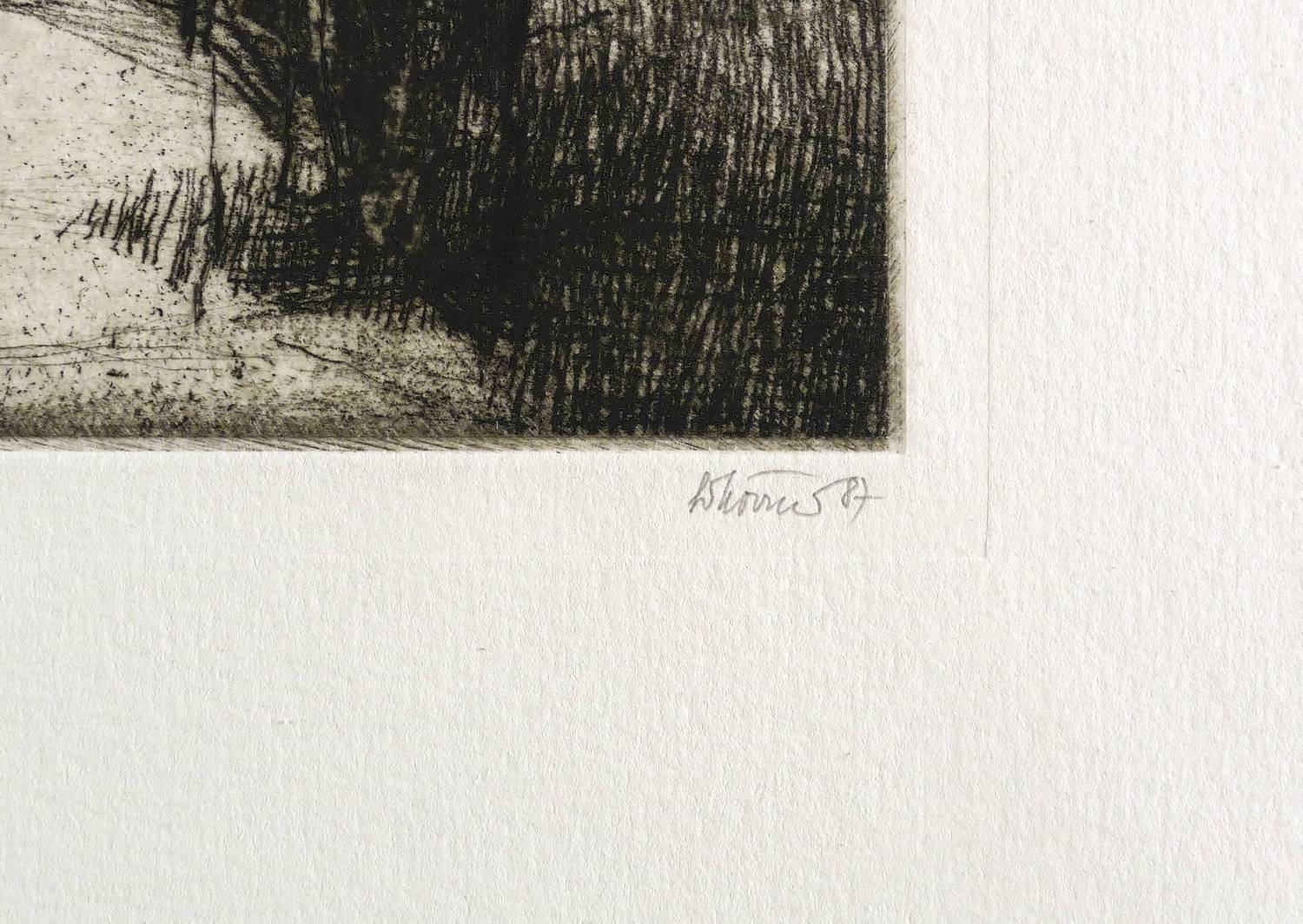 1987. Radierung / Vernis mou & Strichätzung, in Schwarz, auf hellem Velinkarton. – Originale Künstlergrafik, von Gottfried Körner. – Auflage Exemplar Nr. 19/60. – 17,8 x 23,2 cm (Darstellung / Platte), 33 x 31 cm (Blatt).