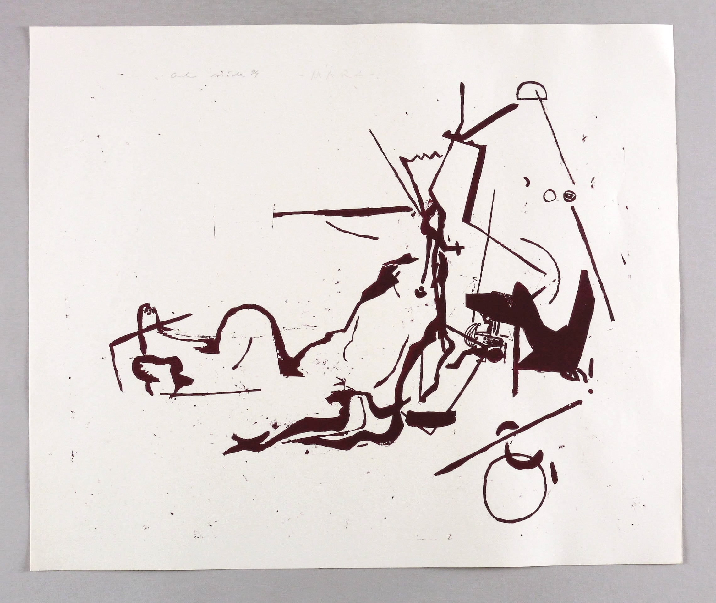 1994. Siebdruck / Serigrafie, in Rotbraun, auf hellgelbem Velin. – Originale Künstlergrafik, von Barbara Mäder-Ruff. – Auflage Exemplar Nr. 8/120. – 34,2 x 40,2 cm (Darstellung / Druckbild), 42 x 50 cm (Blatt).