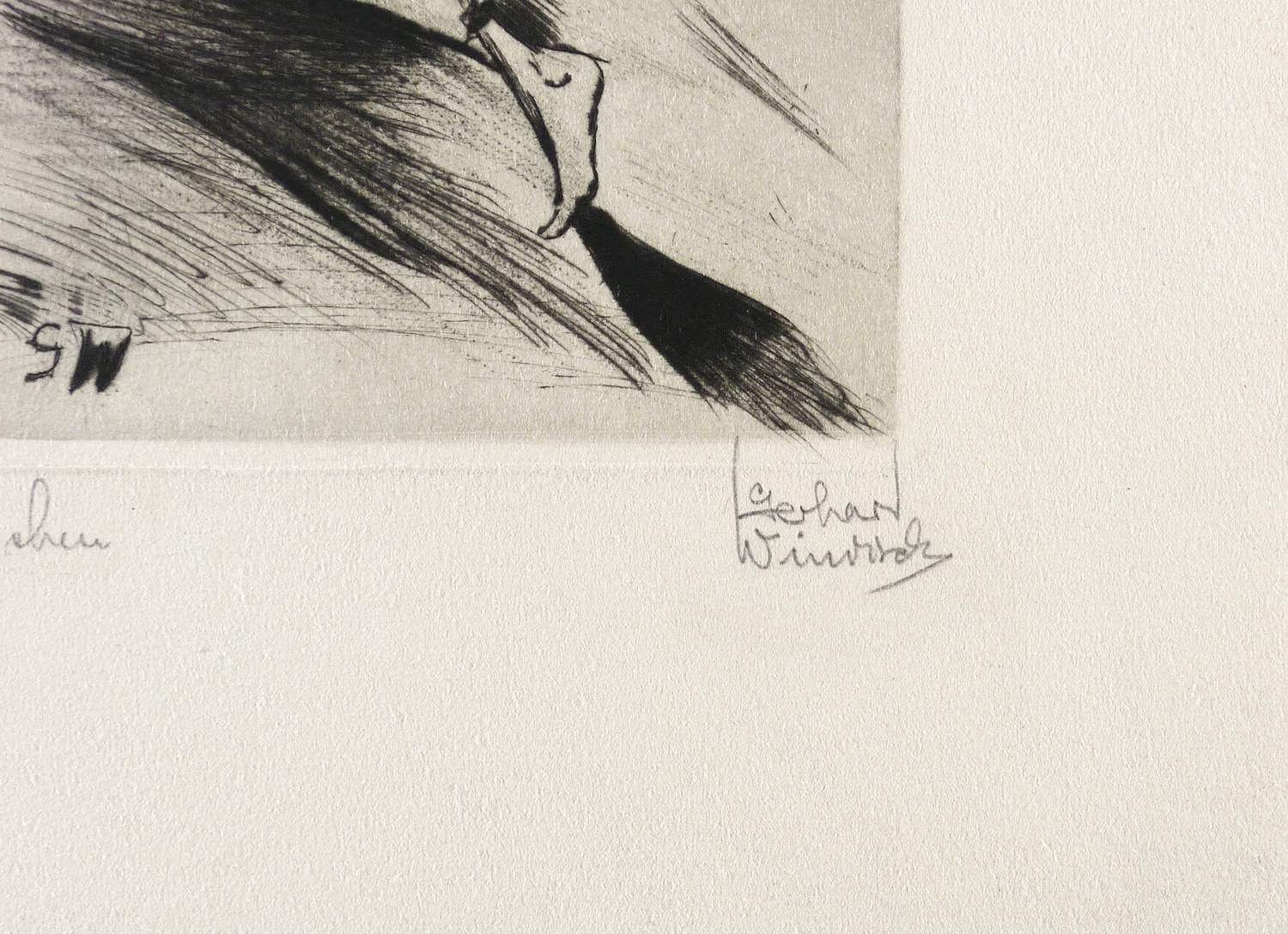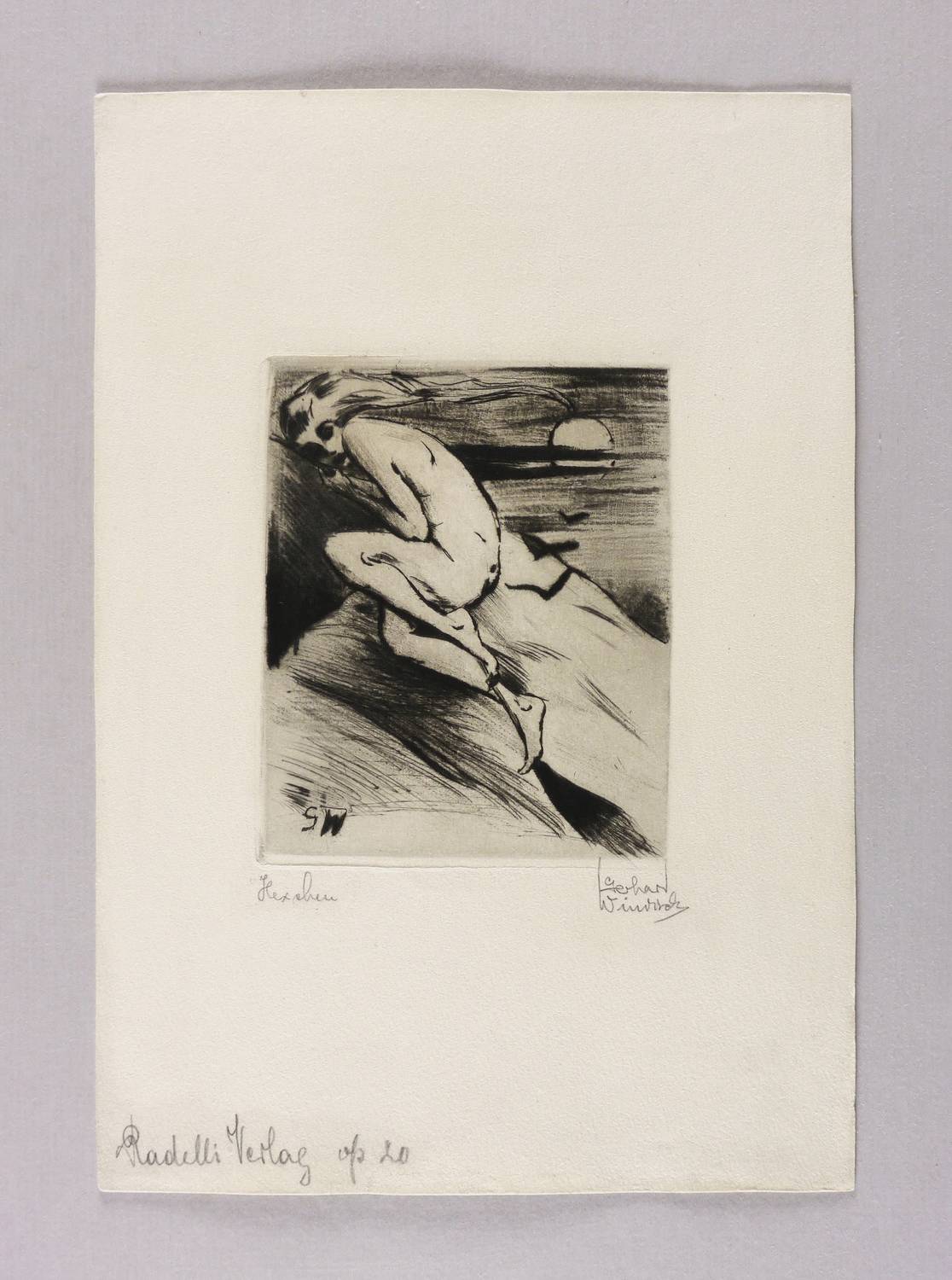 Rechts unten in Bleistift signiert: ″Gerhard Windisch″. Dazu links Titel: ″Hexchen″. In der Platte links unten monogrammiert: ″GW″. Im Blattrand links unten bezeichnet: ″Radelli Verlag / 20″. – Leicht fingerspurig im Rand. Guter Zustand.