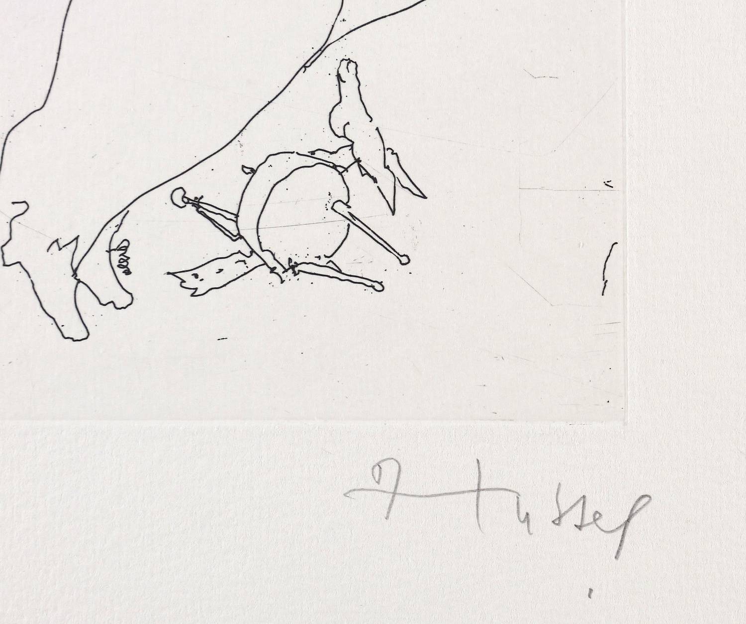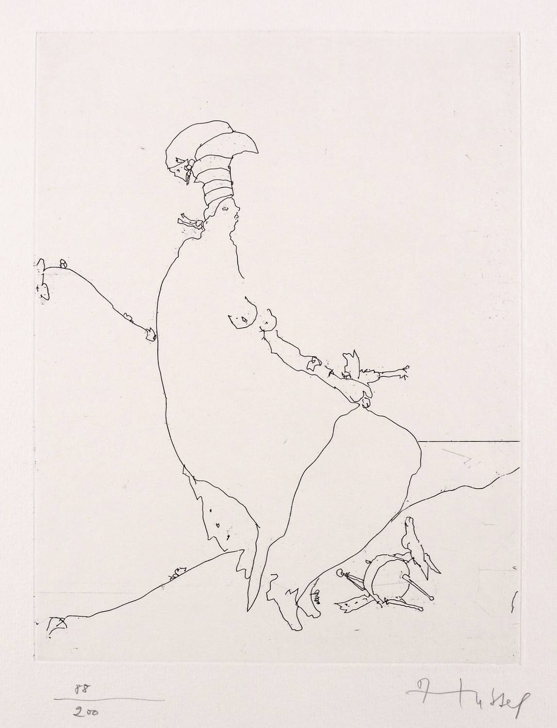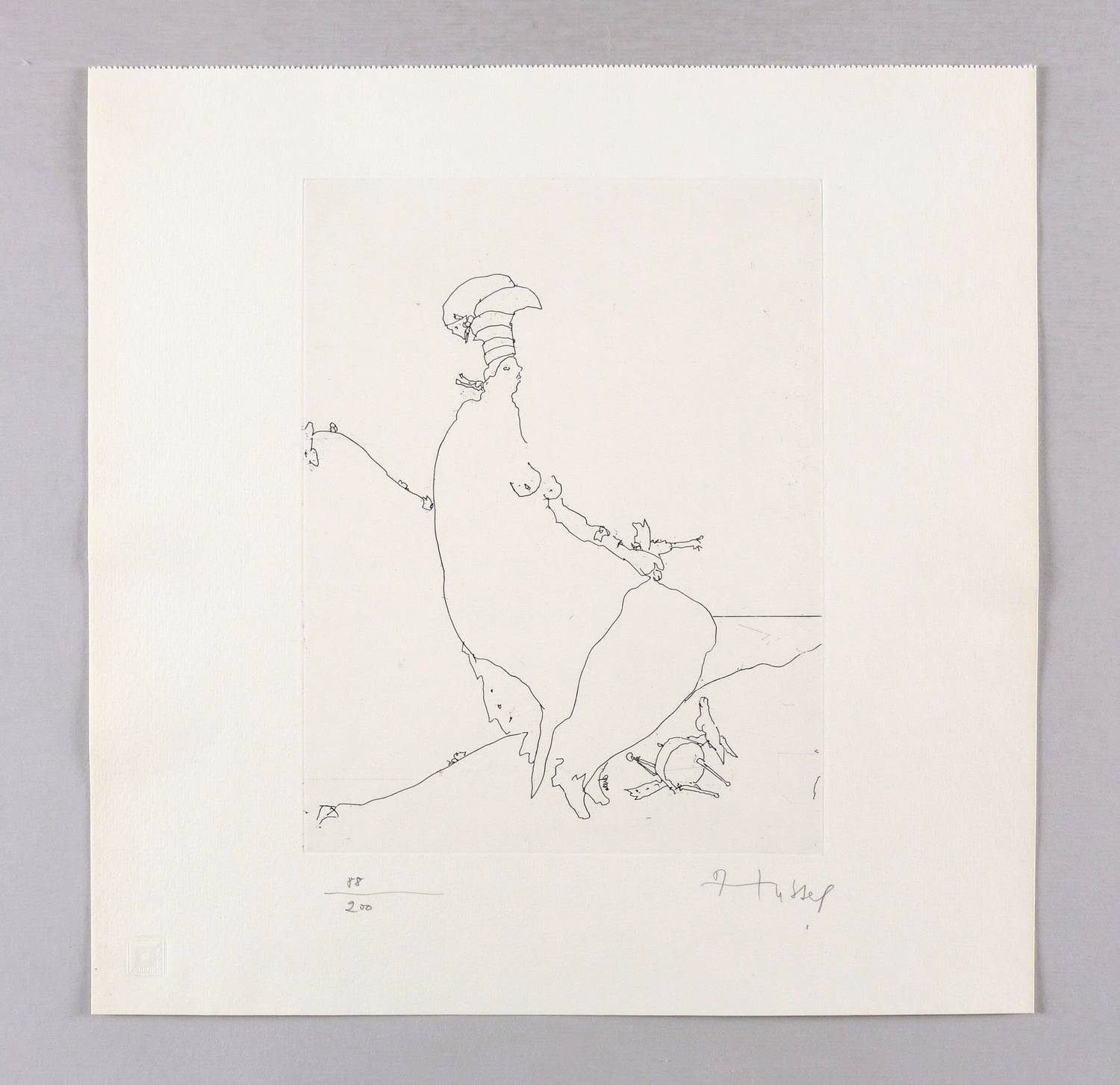 1988. Radierung / Strichätzung, in Schwarz, auf hellgelbem Velinkarton. – Originale Künstlergrafik, von Horst Hussel. – Auflage Exemplar Nr. 88/200. – 25,6 x 19,8 cm (Darstellung / Platte), 36 x 36 cm (Blatt).