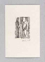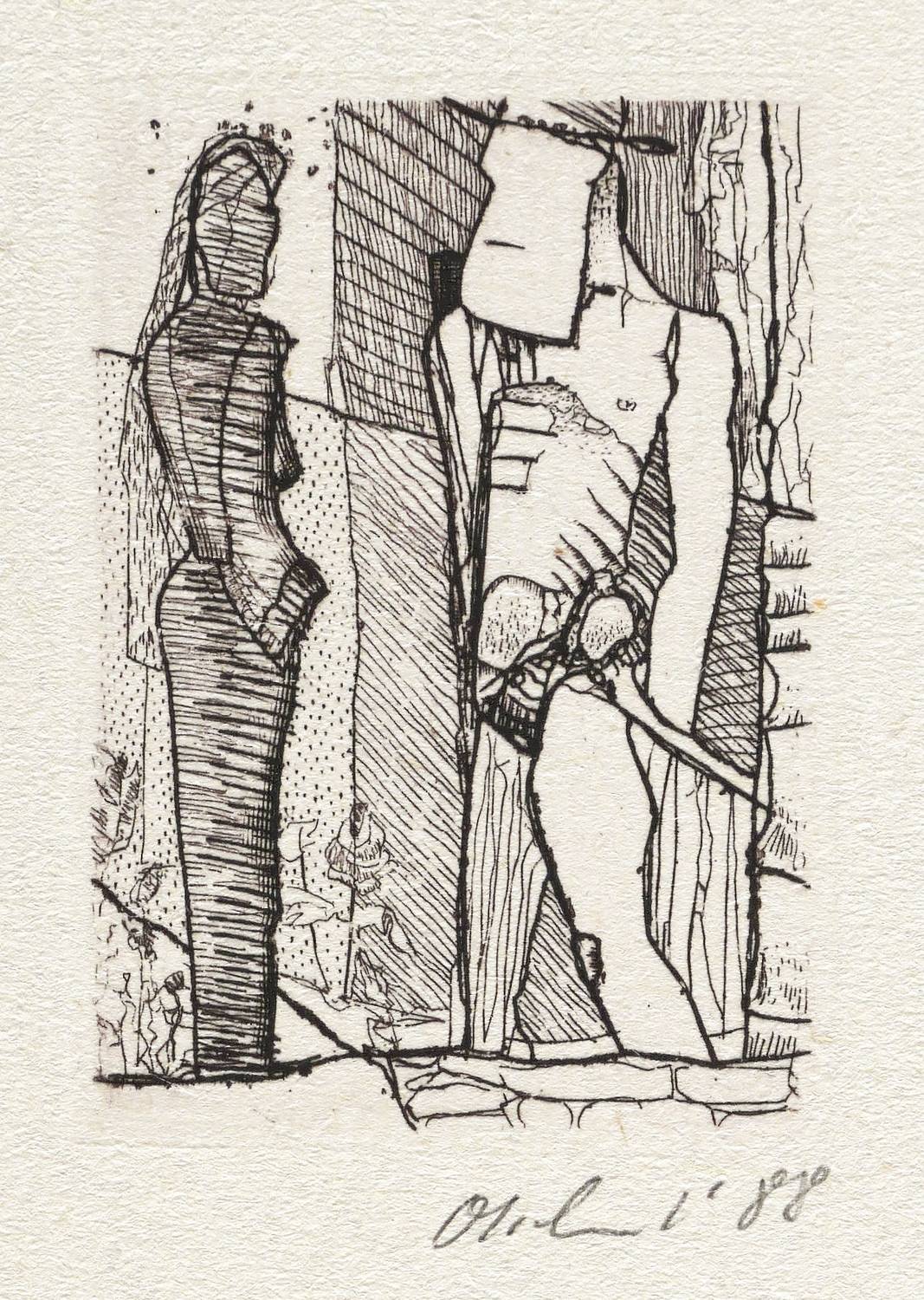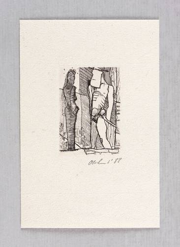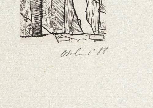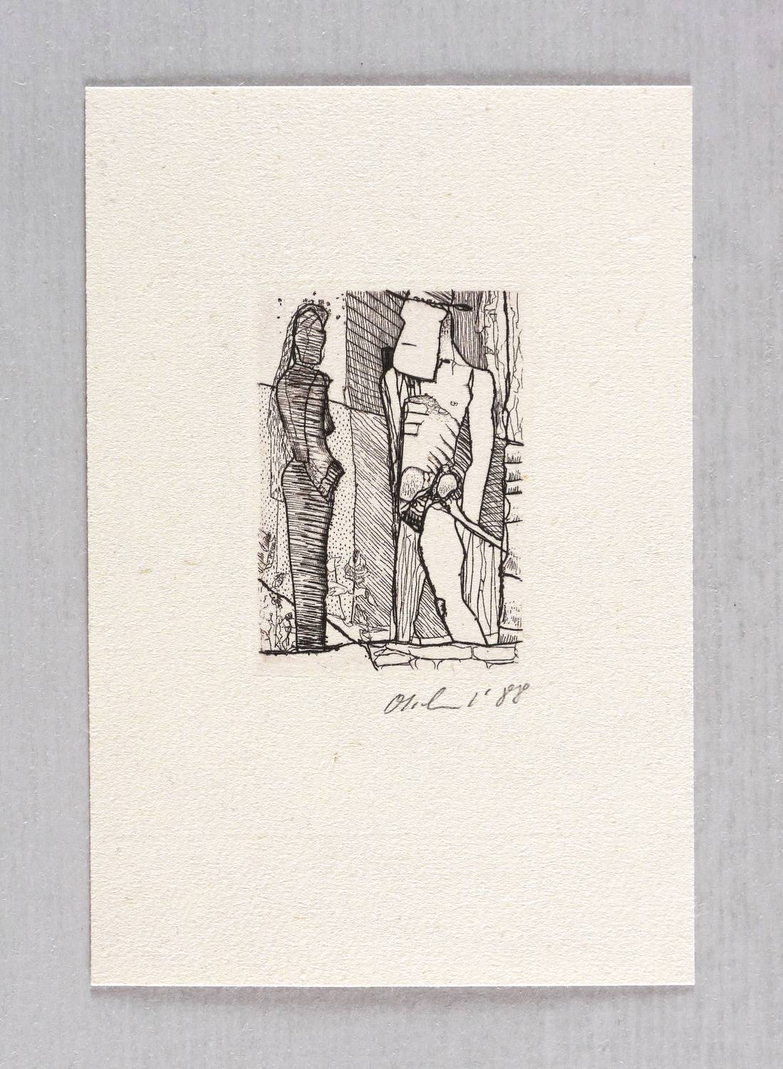 1988. Radierung / Strichätzung, in Schwarz, auf rauem gelbem Mschinenbütten. – Originale Künstlergrafik, von Detlef Olschewski. – 5,7 x 3,9 cm (Darstellung / Platte), 13 x 9 cm (Blatt).